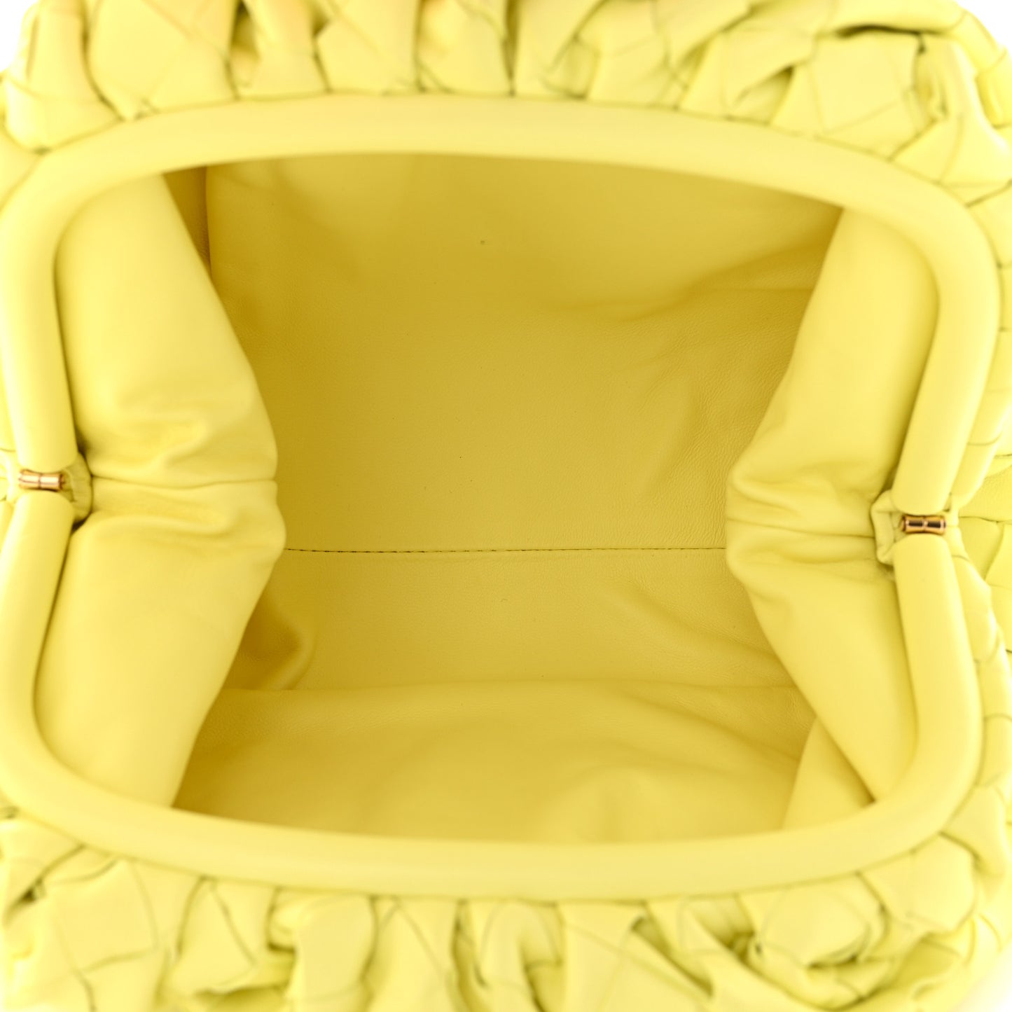 This is an authentic BOTTEGA VENETA Nappa Intrecciato Teen Pouch in Corn. This ultra-popular clutch is crafted of supple woven lambskin leather in fluorescent yellow. The bag features a ruched leather magnetic frame top that opens to a matching leather interior.