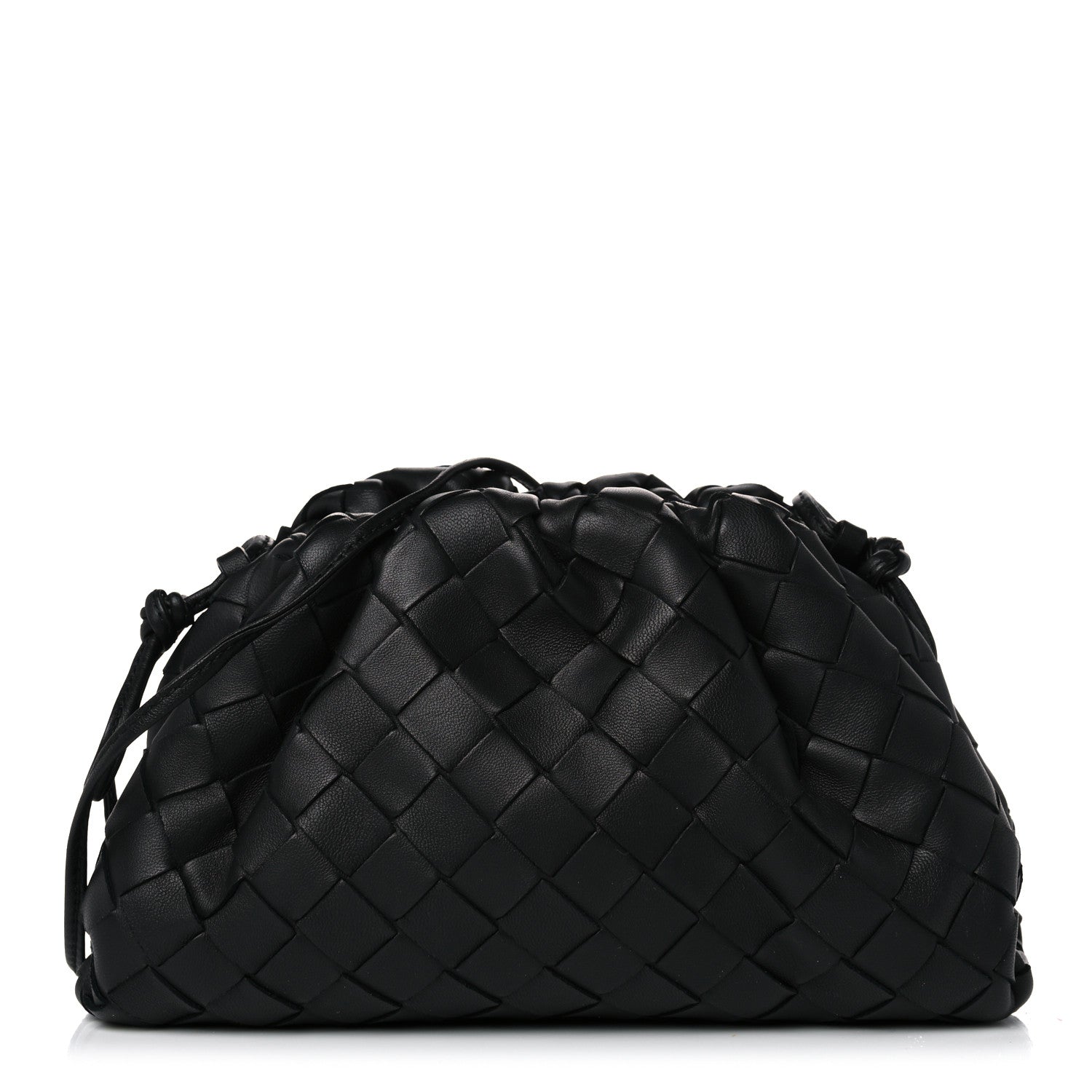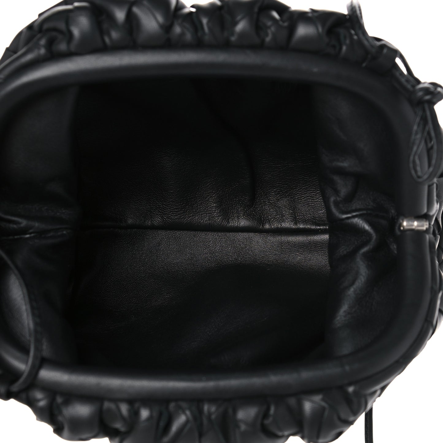 This is an authentic BOTTEGA VENETA Nappa Intrecciato The Mini Pouch in Black. This ultra-popular clutch is crafted of supple calfskin leather in black. The bag features a ruched leather magnetic frame top that opens to a matching leather interior. A long thin crossbody strap is accented with signature knotted ends.Follow this item for alerts. Bottega Veneta is a registered trademark of Bottega Veneta. FASHIONPHILE is not affiliated with Bottega Veneta.