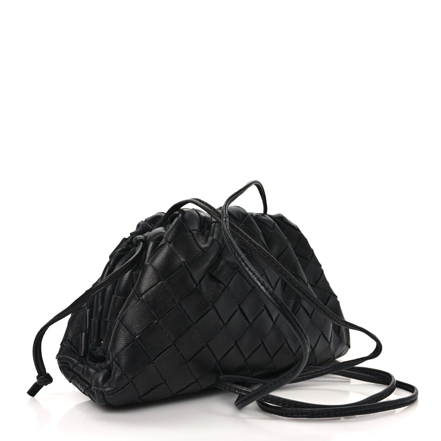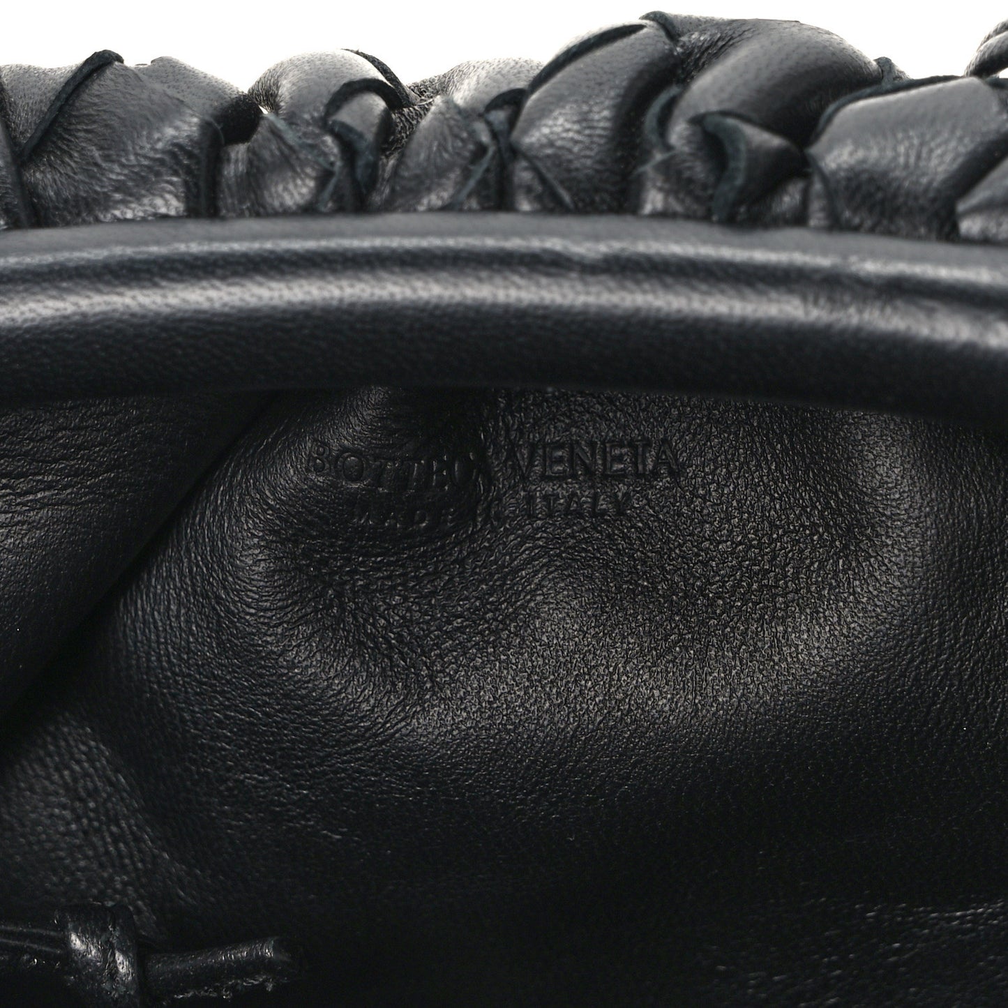 This is an authentic BOTTEGA VENETA Nappa Intrecciato The Mini Pouch in Black. This popular mini bag is crafted of woven lambskin leather in black. The bag features a long, thing leather crossbody strap and a ruched leather magnetic frame top that opens to a smooth black leather interior.Follow this item for alerts. Bottega Veneta is a registered trademark of Bottega Veneta. FASHIONPHILE is not affiliated with Bottega Veneta.