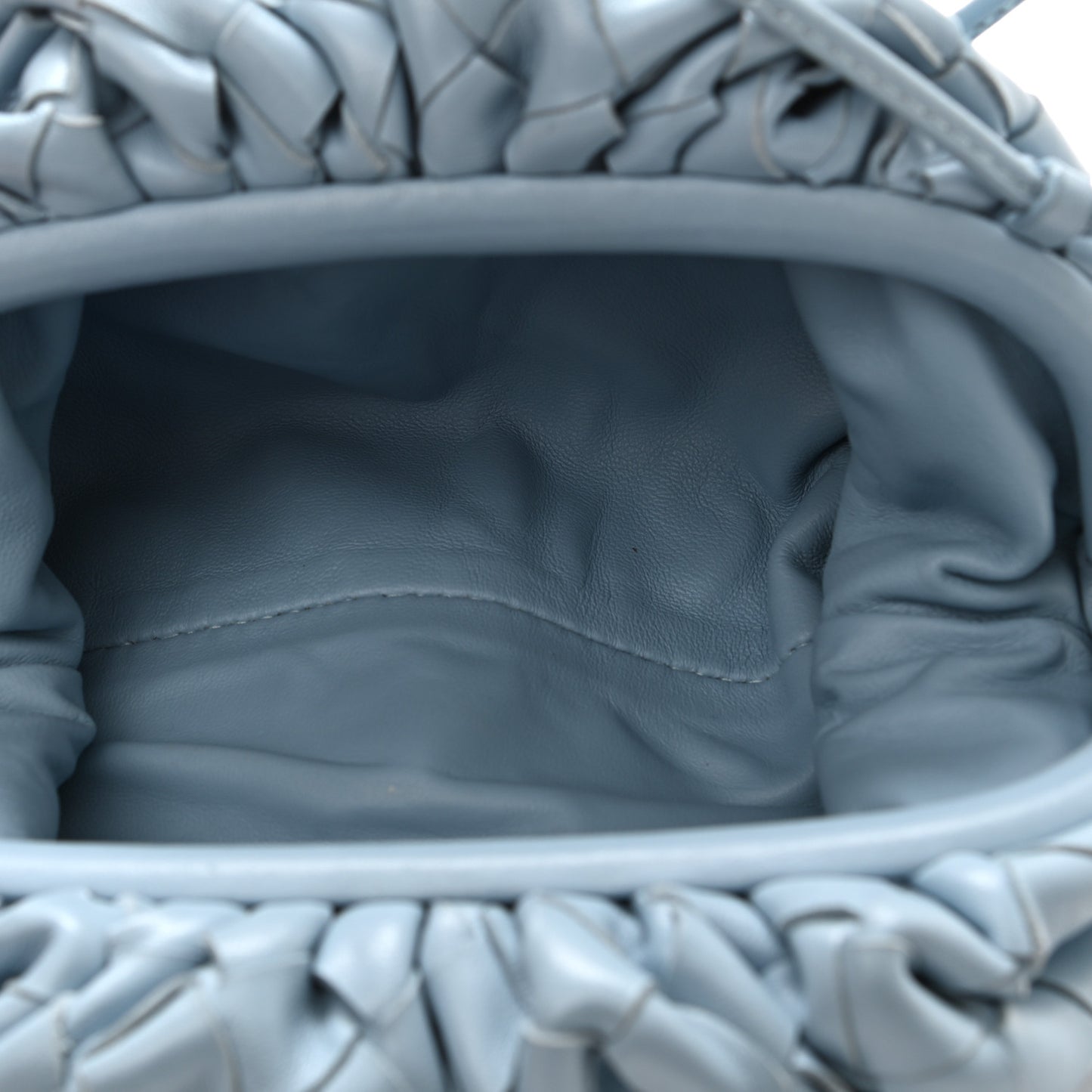 This is an authentic BOTTEGA VENETA Nappa Intrecciato The Mini Pouch in Ice. This petite shoulder bag is crafted of woven nappa leather in baby blue. The bag features a long, thin leather shoulder strap, and a magnetic top frame that opens to a smooth baby blue leather interior.Follow this item for alerts. Bottega Veneta is a registered trademark of Bottega Veneta. FASHIONPHILE is not affiliated with Bottega Veneta.