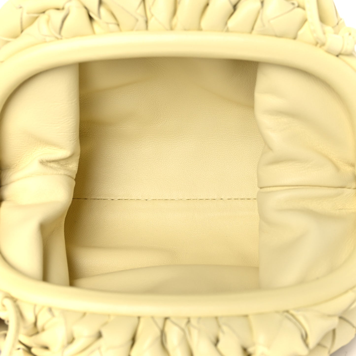 This is an authentic BOTTEGA VENETA Nappa Intrecciato The Mini Pouch in Ice Cream. This petite shoulder bag is crafted of woven lambskin leather in pale yellow. The bag features a long, thin leather shoulder strap, and a magnetic top frame that opens to a smooth yellow leather interior.Follow this item for alerts. Bottega Veneta is a registered trademark of Bottega Veneta. FASHIONPHILE is not affiliated with Bottega Veneta.
