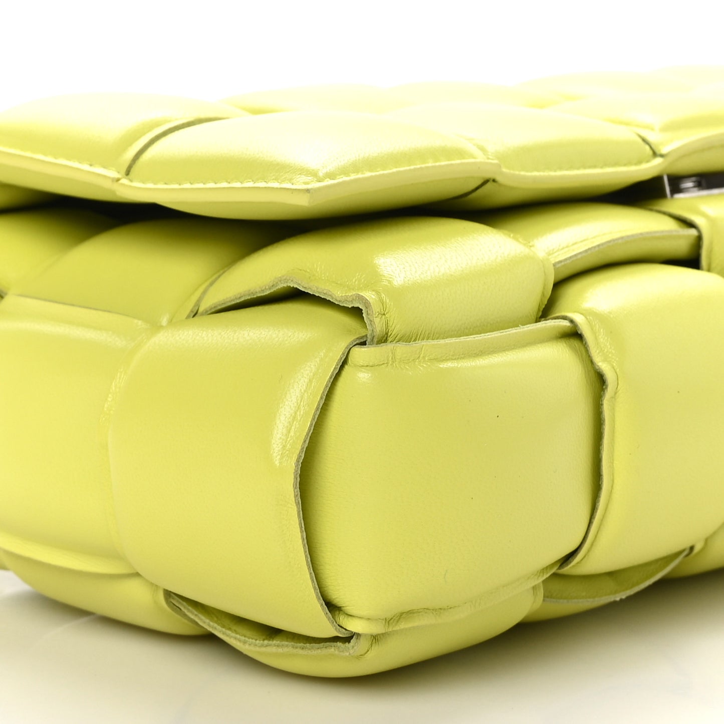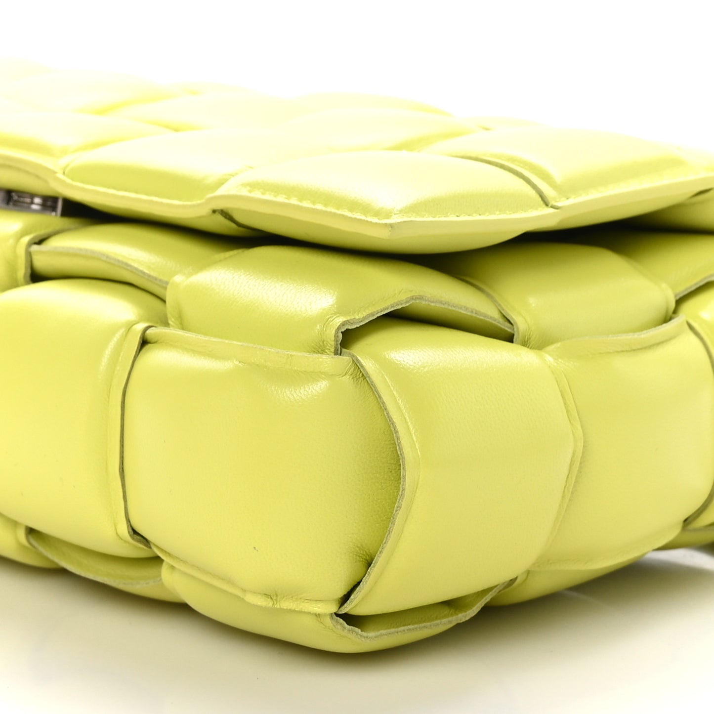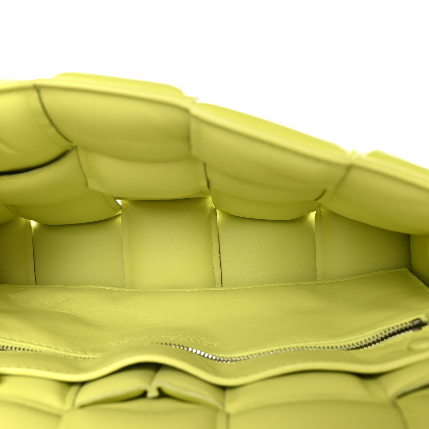This is an authentic BOTTEGA VENETA Nappa Maxi Intrecciato Padded Cassette Crossbody Bag in Seagrass. This stylish shoulder bag is crafted of soft padded and woven nappa leather in bright yellow. The bag features an adjustable leather shoulder strap and opens to a matching leather interior with a zipper pocket.