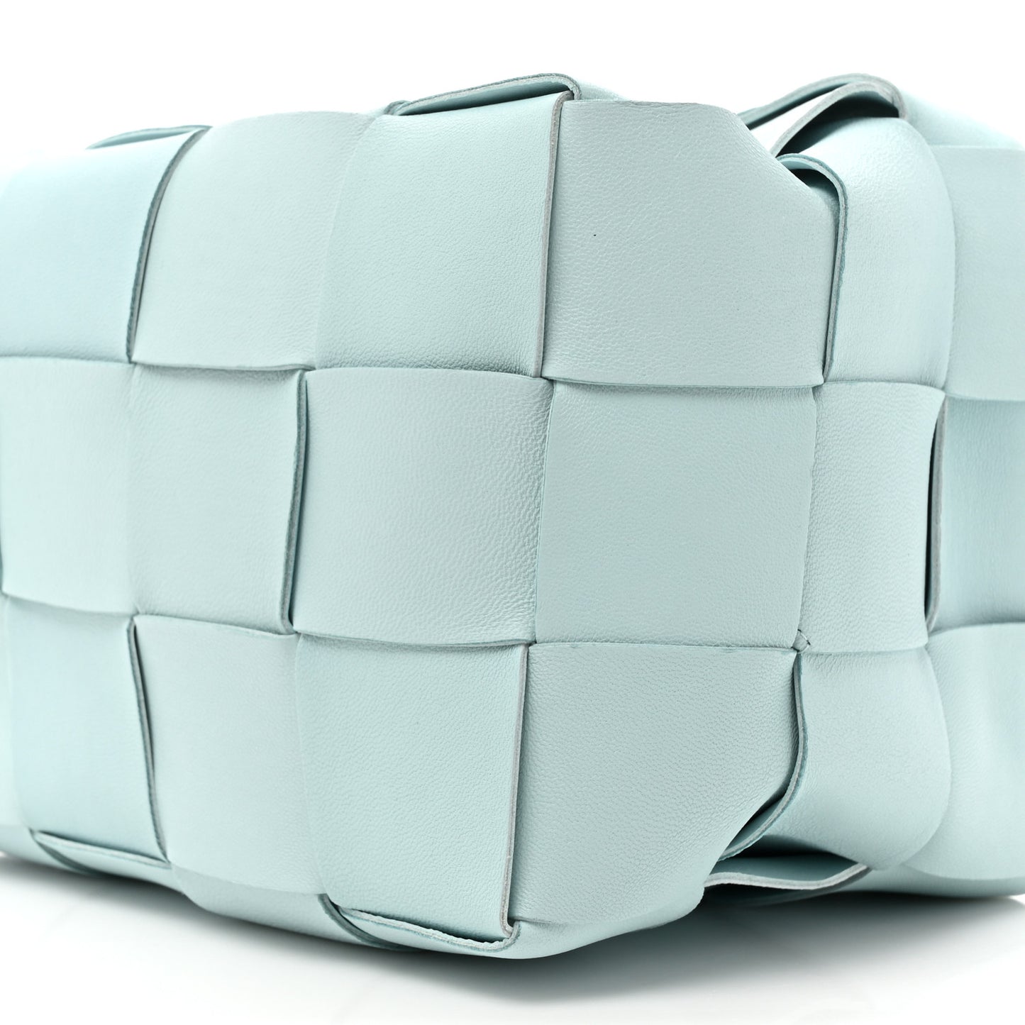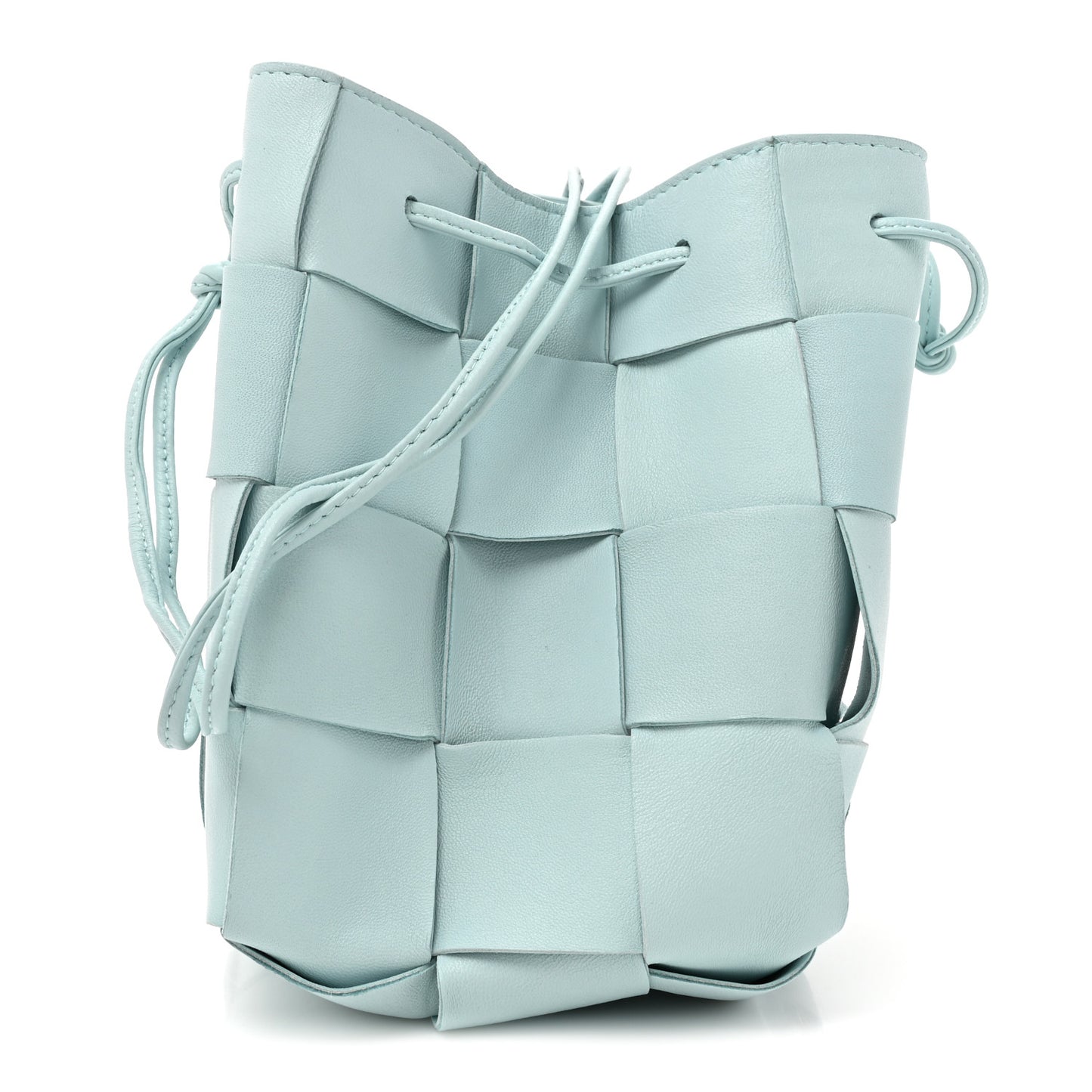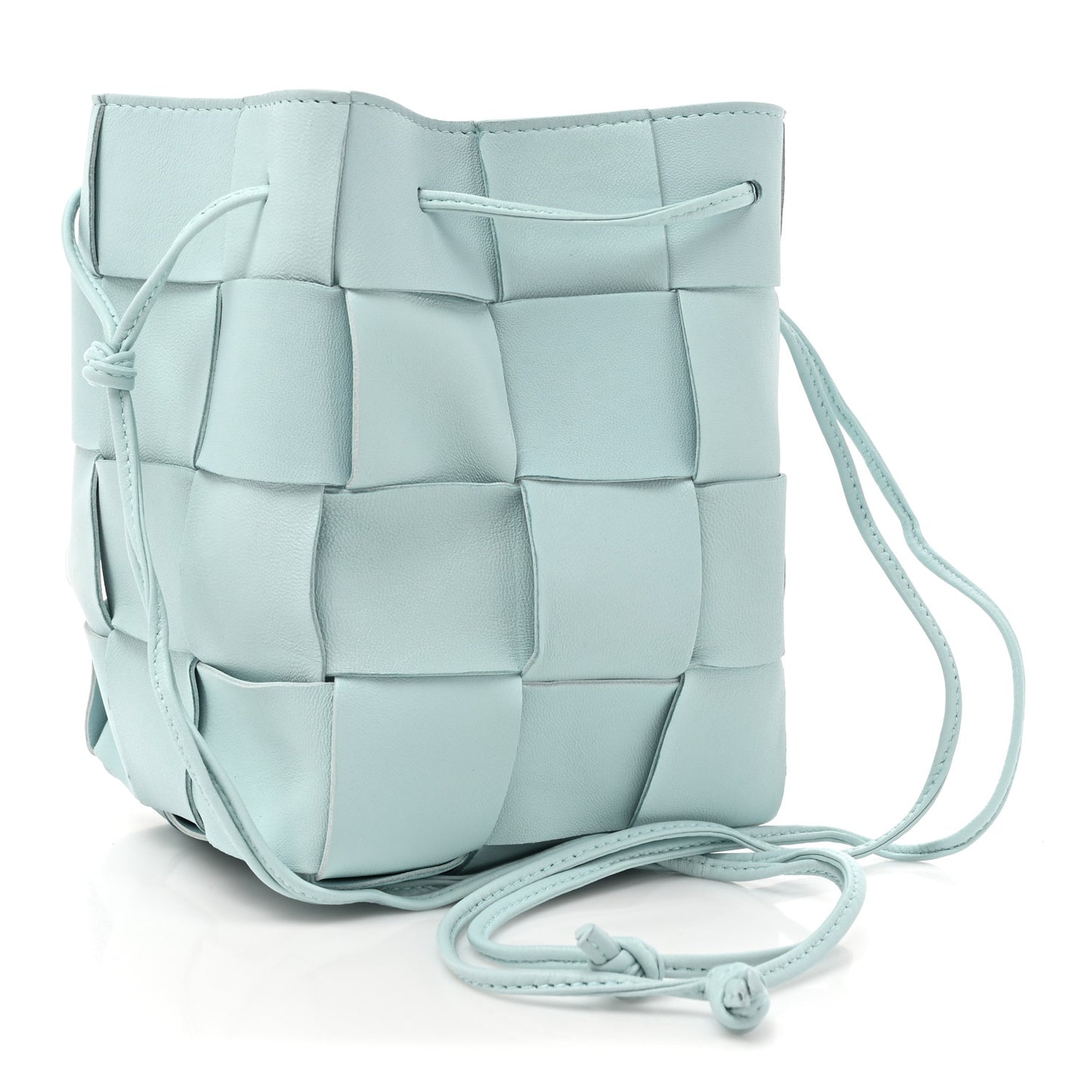 This is an authentic BOTTEGA VENETA Nappa Maxi Intrecciato Small Cassette Bucket Bag in Topazio Silver. This stylish rectangular bucket bag is crafted of soft woven nappa leather in light blue. The bag features a top cinch cord that extends into a thin leather shoulder strap and the top is open to a matching leather interior.Follow this item for alerts. Bottega Veneta is a registered trademark of Bottega Veneta. FASHIONPHILE is not affiliated with Bottega Veneta.