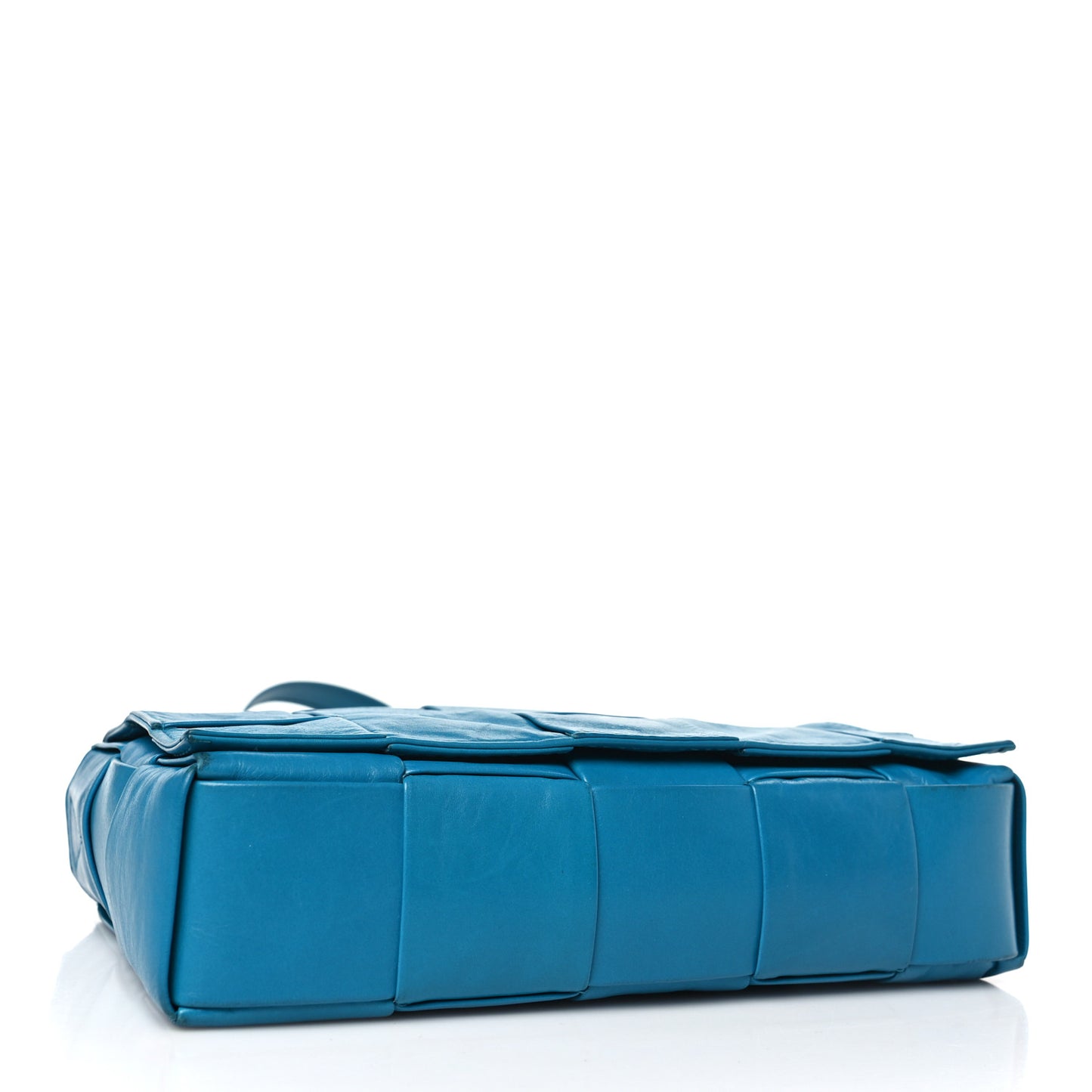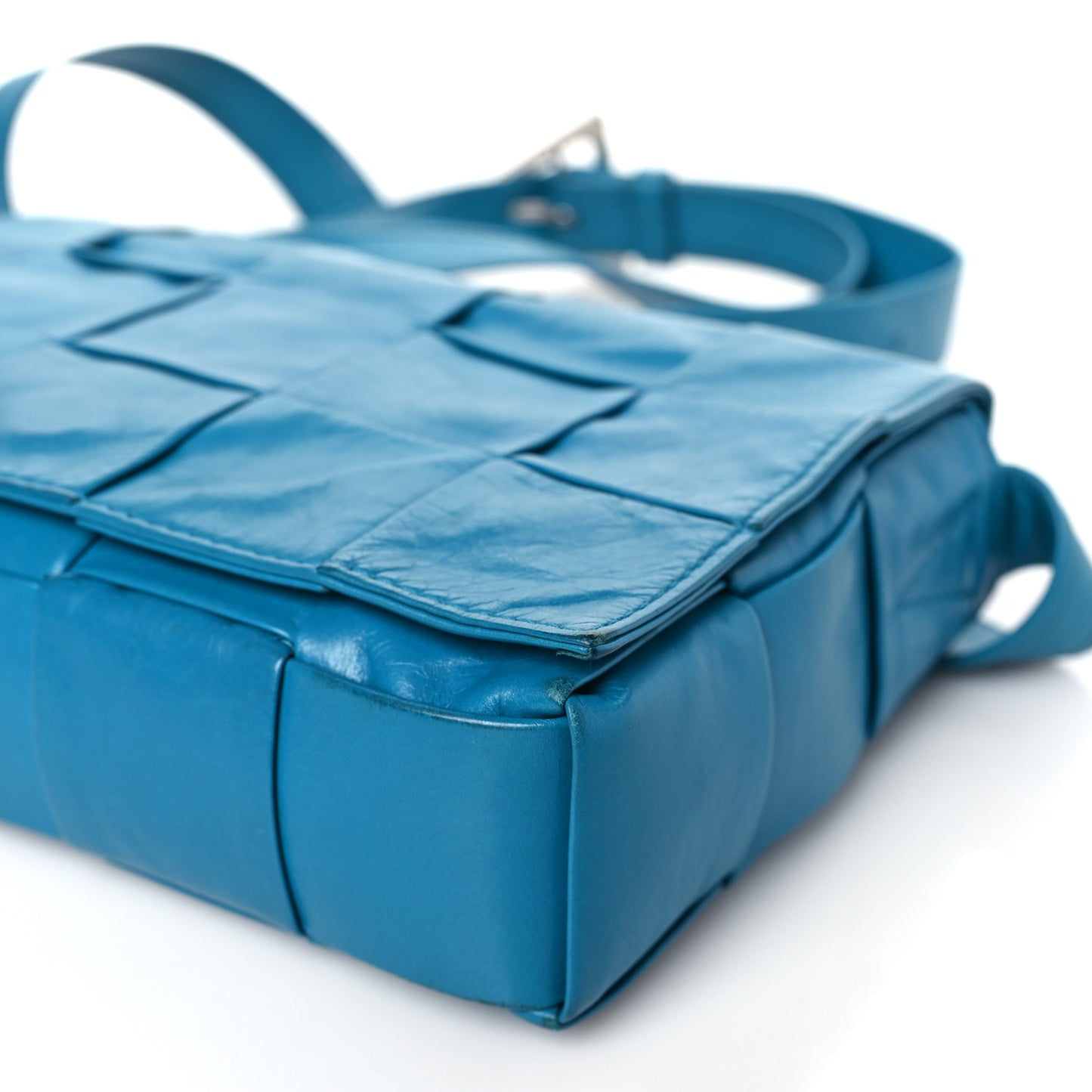 This is an authentic BOTTEGA VENETA Paper Calfskin Maxi Intreccio Cassette Crossbody Bag in Blaster. This stylish shoulder bag is crafted of woven textured calfskin leather in blue. The bag features an adjustable leather shoulder strap with a silver metal buckle and a front flap that opens to a matching fabric interior with a zipper pocket.Follow this item for alerts. Bottega Veneta is a registered trademark of Bottega Veneta. FASHIONPHILE is not affiliated with Bottega Veneta.