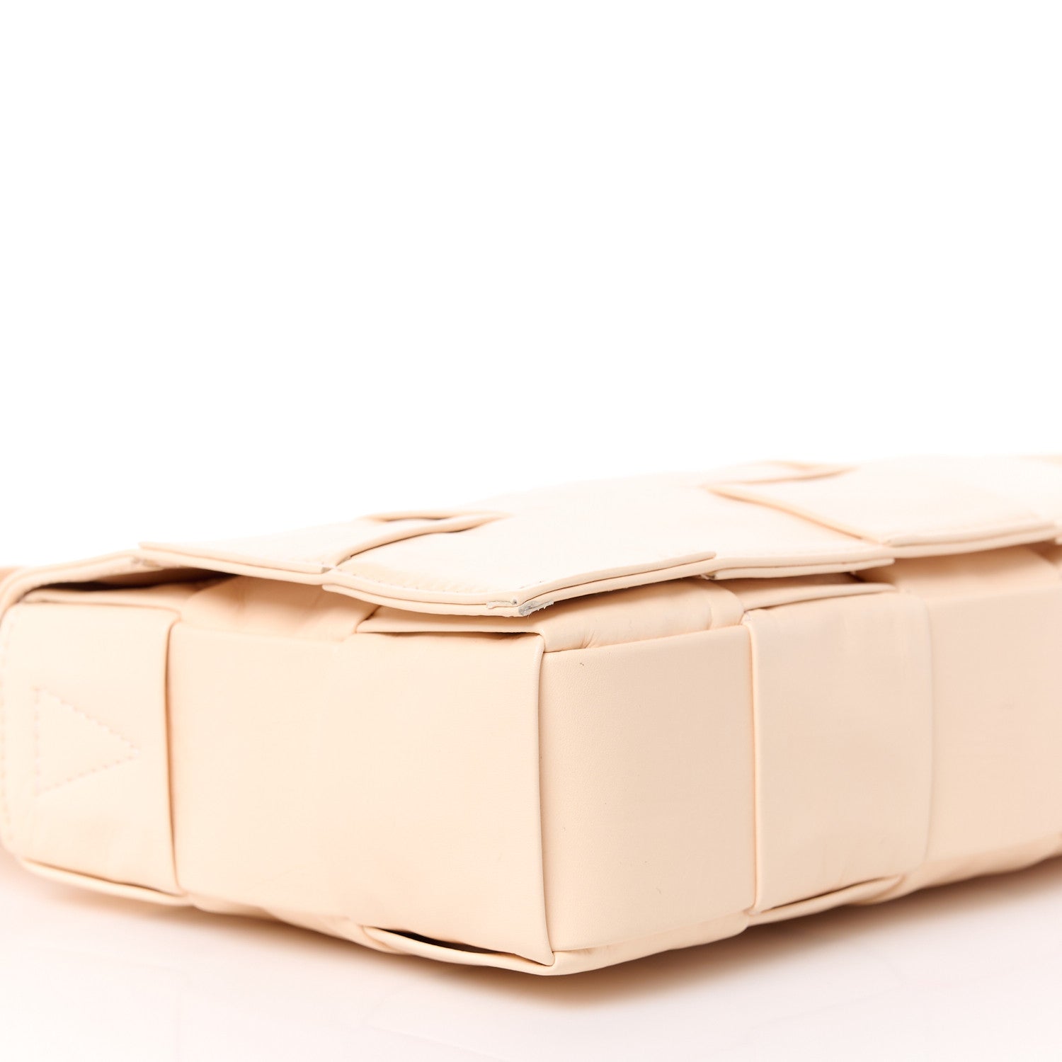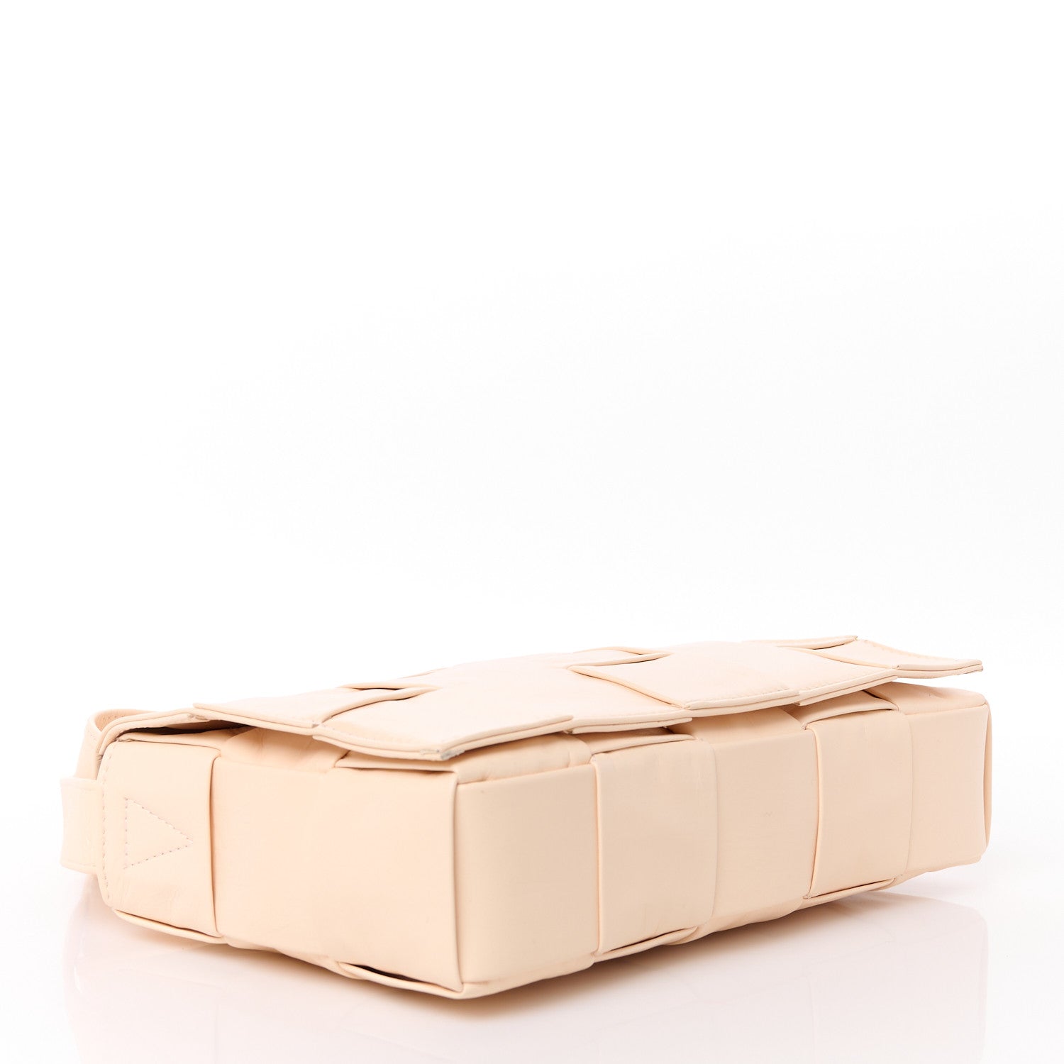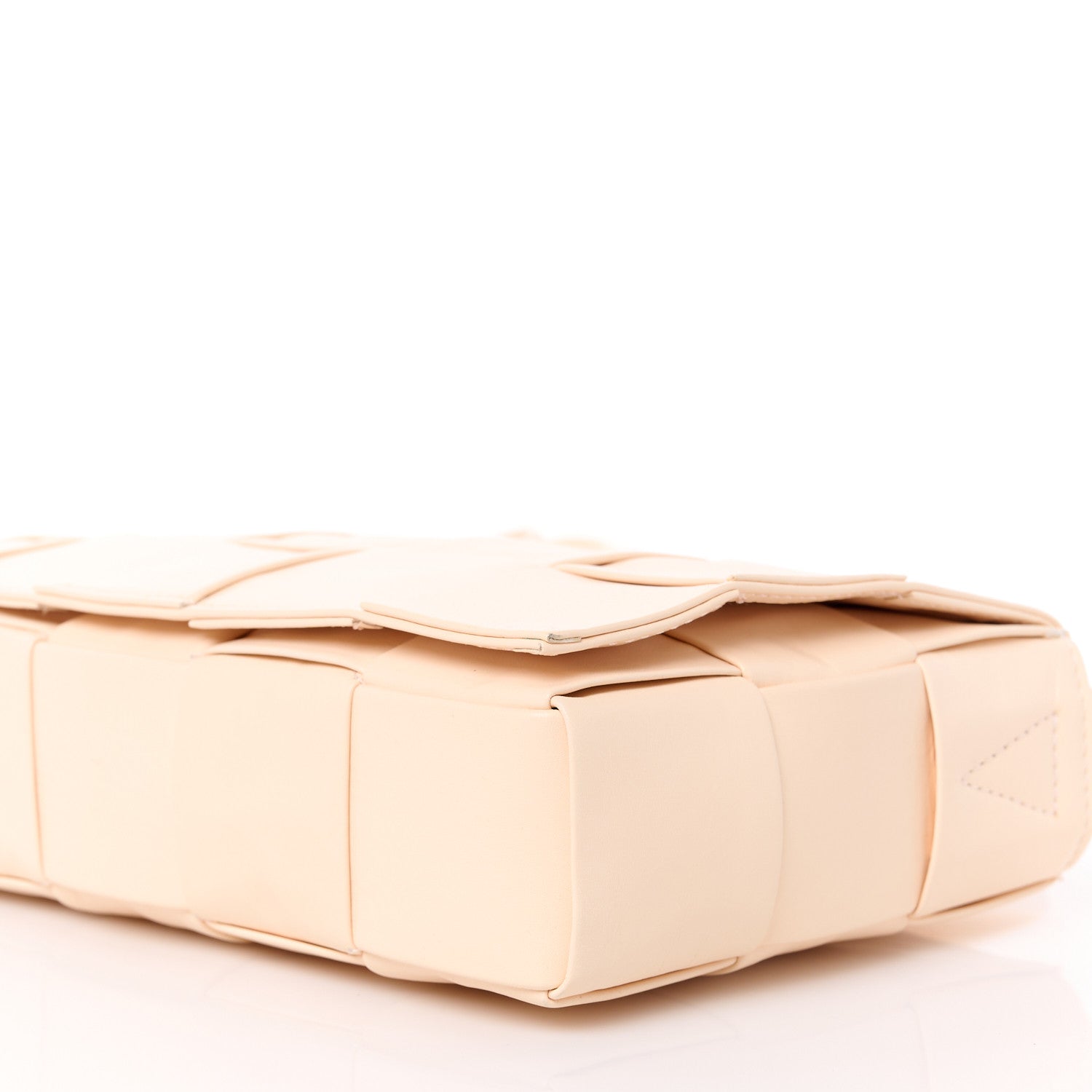This is an authentic BOTTEGA VENETA Paper Calfskin Maxi Intreccio Cassette Crossbody Bag in Melon Washed. This stylish messenger bag is crafted of tightly woven intrecciato beige leather. The bag features a matching adjustable crossbody strap with silver hardware and a front flap.Follow this item for alerts. Bottega Veneta is a registered trademark of Bottega Veneta. FASHIONPHILE is not affiliated with Bottega Veneta.