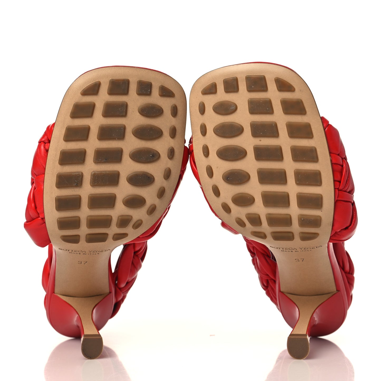 This is a authentic pair of BOTTEGA VENETA Shiny Nappa Intrecciato The Board Sandals 37 in Nail Polish. These stylish strappy sandals are crafted of padded and twisted Intrecciato leather in red. These heels feature interwoven strap detailing and a 3.75-inch heel.