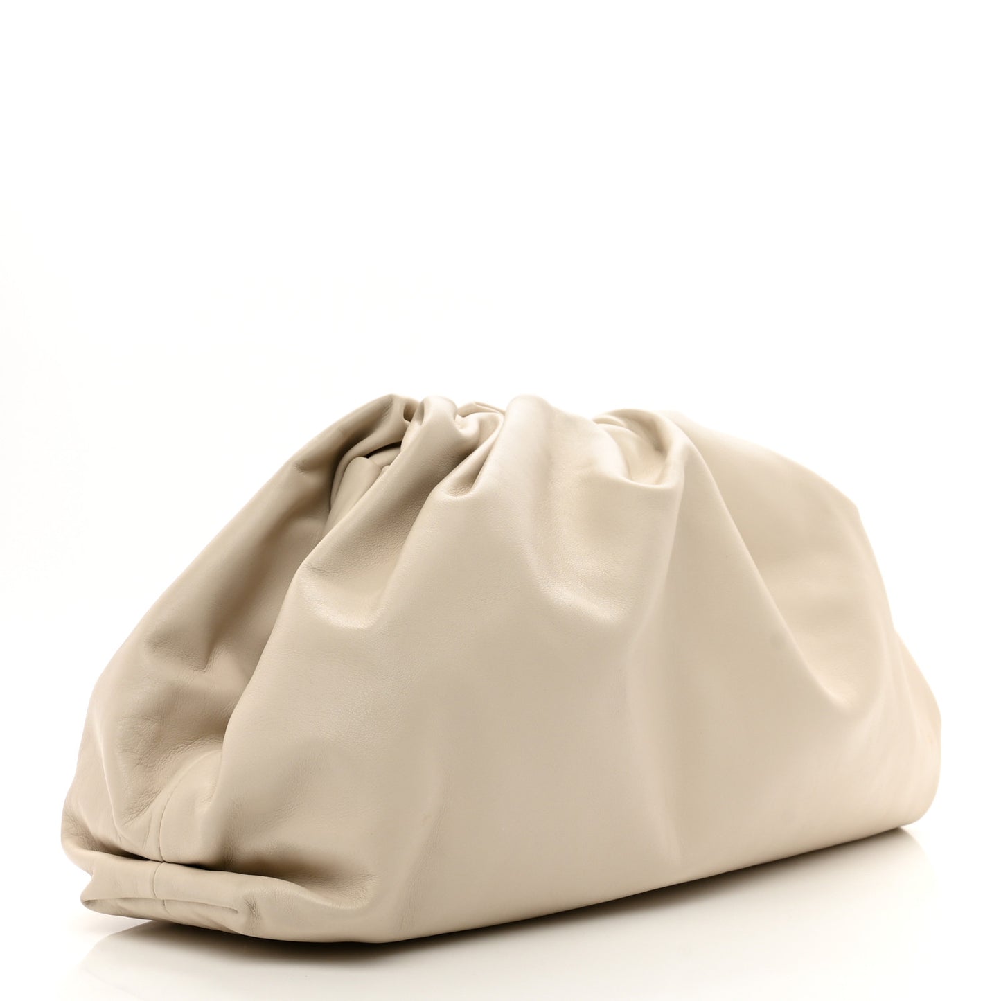 This is an authentic BOTTEGA VENETA Smooth Butter Calf The Pouch Oversized Clutch in Mist. This ultra popular clutch is crafted of supple calfskin leather in off white. The bag features a ruched leather magnetic frame top that opens to a matching leather interior.Follow this item for alerts. Bottega Veneta is a registered trademark of Bottega Veneta. FASHIONPHILE is not affiliated with Bottega Veneta.