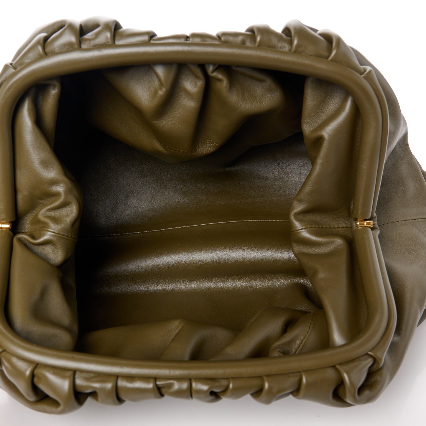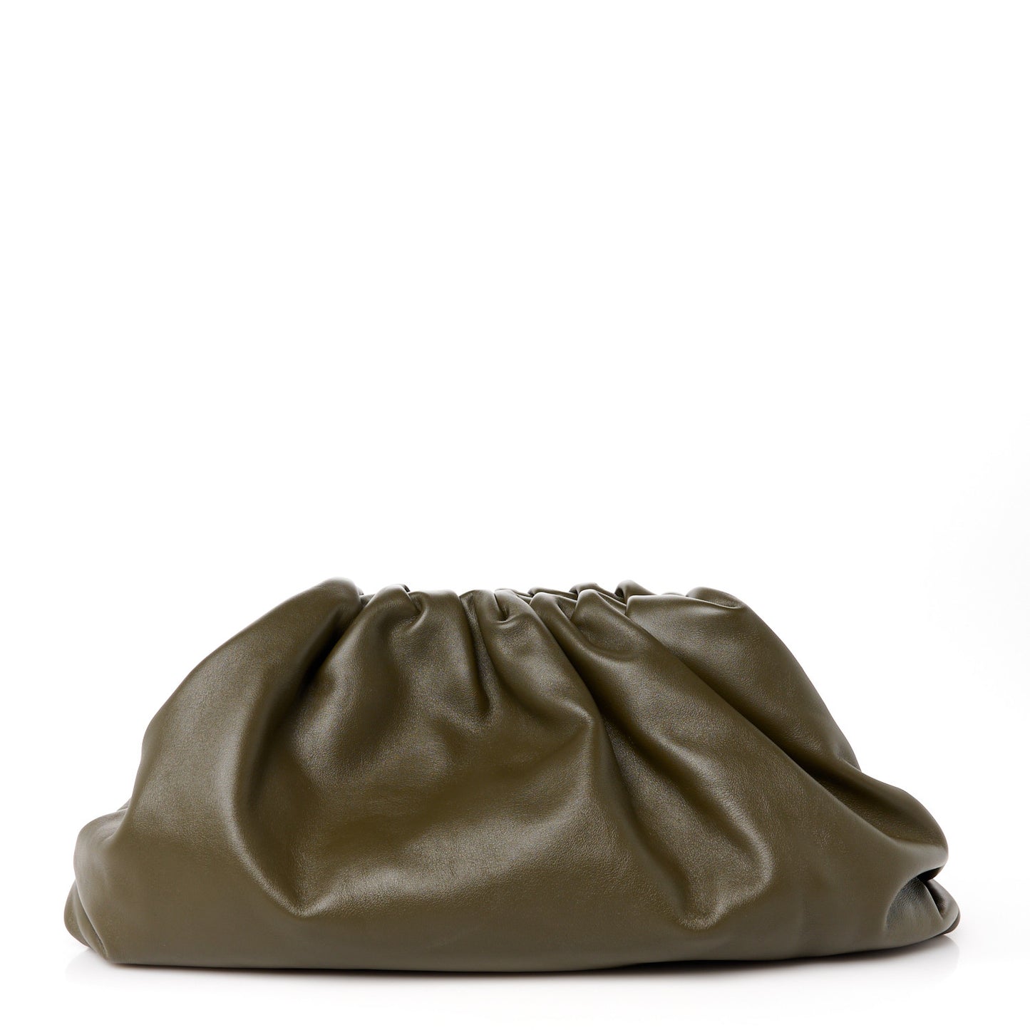 This is an authentic BOTTEGA VENETA Smooth Butter Calf The Pouch Oversized Clutch in Mud. This stylish clutch is crafted of calfskin leather in dark green and features a ruched leather magnetic top that opens to a matching leather interior.Follow this item for alerts. Bottega Veneta is a registered trademark of Bottega Veneta. FASHIONPHILE is not affiliated with Bottega Veneta.