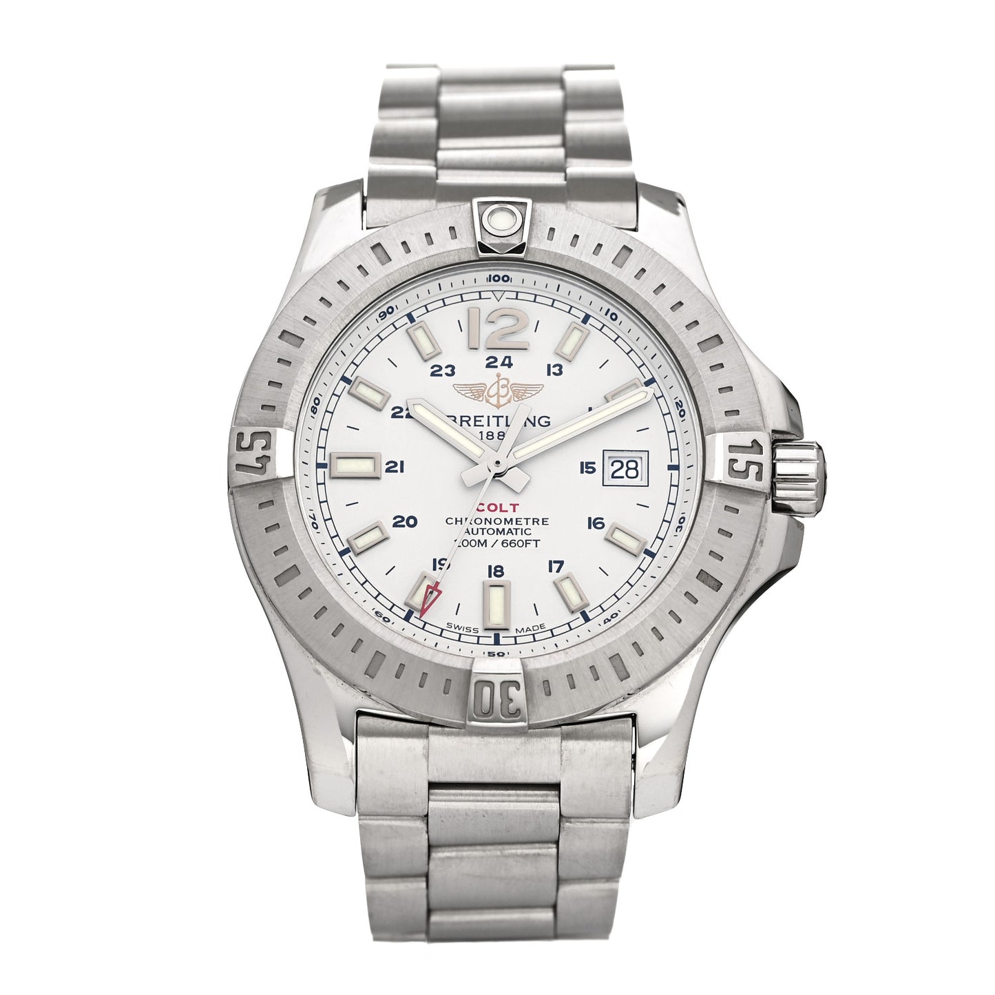 This is an authentic BREITLING Stainless Steel 44mm Colt Automatic Watch White A17388. The watch is crafted of stainless steel and features a white dial, white luminescent hands and hour markers, a date display, and an automatic movement.Follow this item for alerts. Breitling is a registered trademark of Breitling. FASHIONPHILE is not affiliated with Breitling.