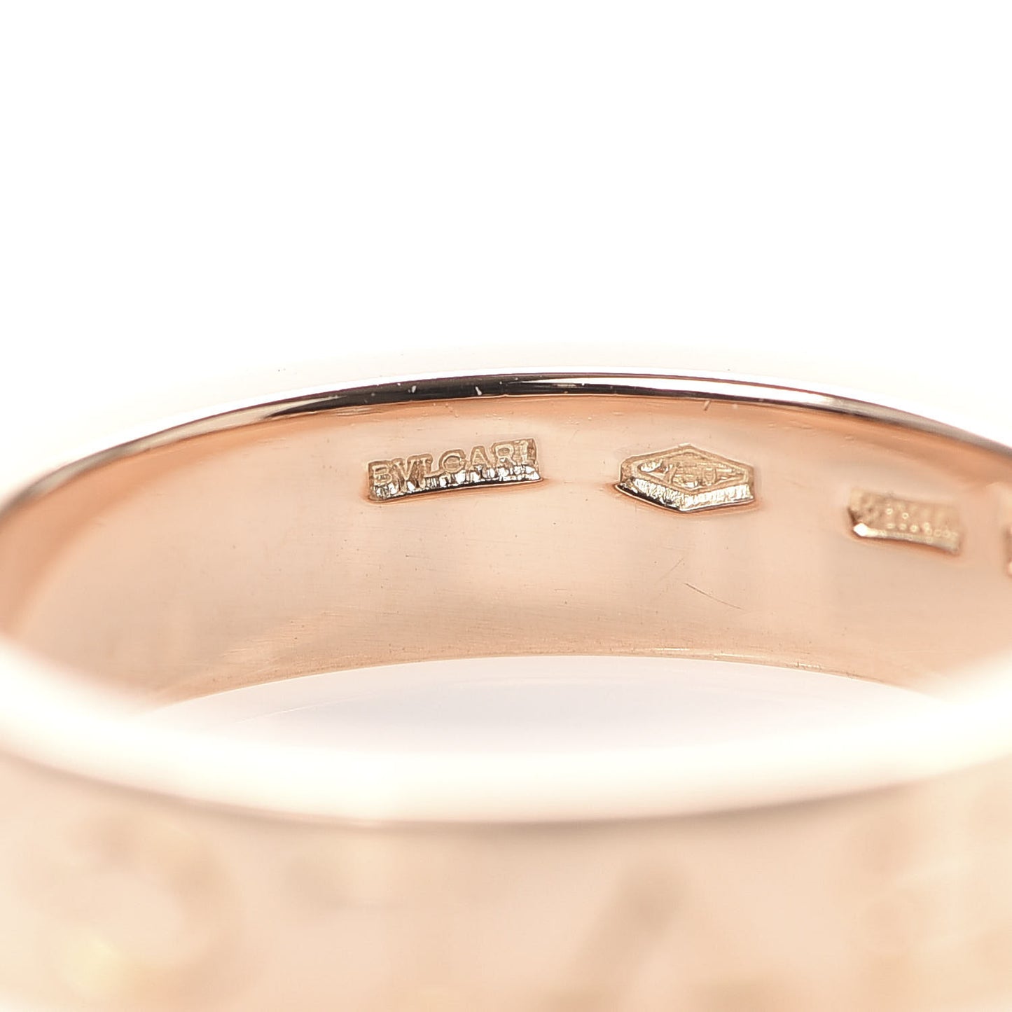 This is an authentic BULGARI 18K Rose Gold Diamond BVLGARI BVLGARI Band Ring size 47 or 4. The ring is crafted of 18 karat rose gold and features the engraved BVLGARI logo and a single diamond weighing approximately .04 carats. This is a chic ring with the classic style of Bulgari!Follow this item for alerts. Bulgari is a registered trademark of Bulgari. FASHIONPHILE is not affiliated with Bulgari.