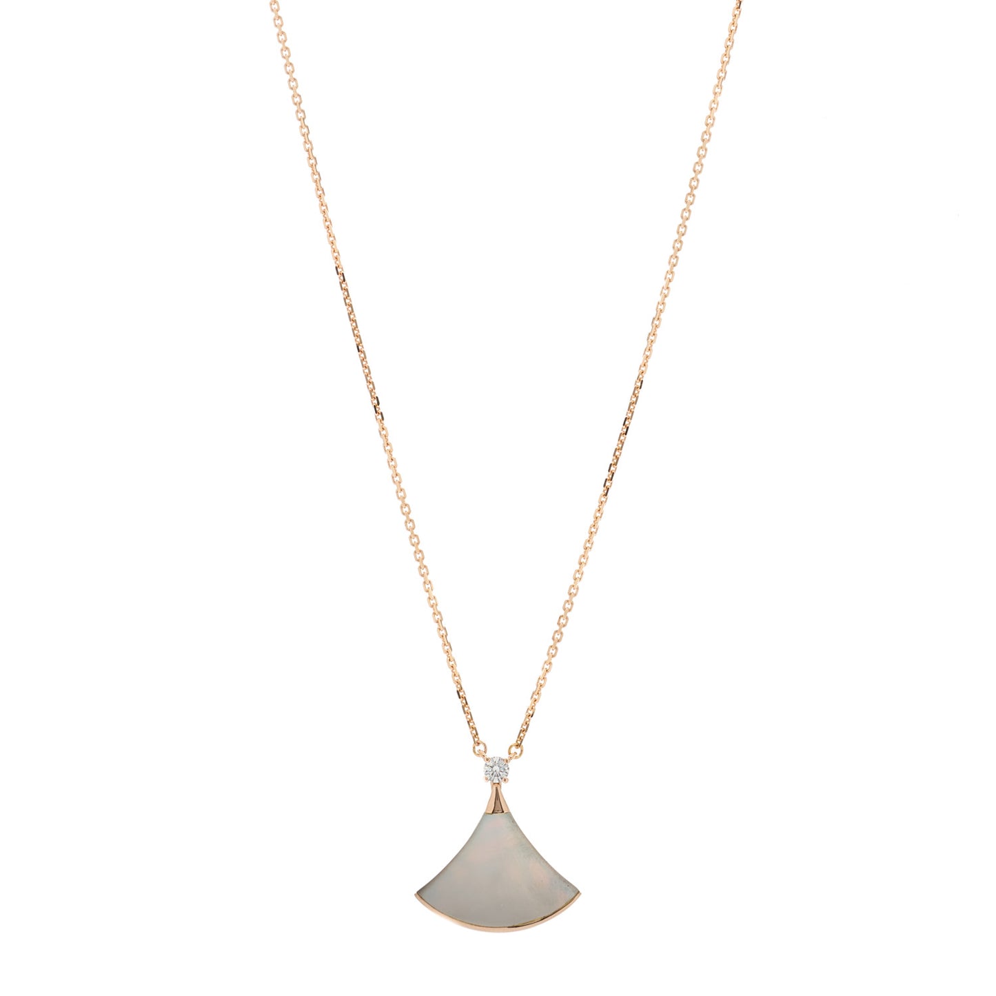 This is an authentic BULGARI 18K Rose Gold Diamond Mother of Pearl Divas' Dream Pendant Necklace. The necklace is crafted of 18 karat rose gold and features a fan motif pendant set with white mother of pearl and a single round brilliant cut diamond weighing approximately .10 carat.Follow this item for alerts. Bulgari is a registered trademark of Bulgari. FASHIONPHILE is not affiliated with Bulgari.