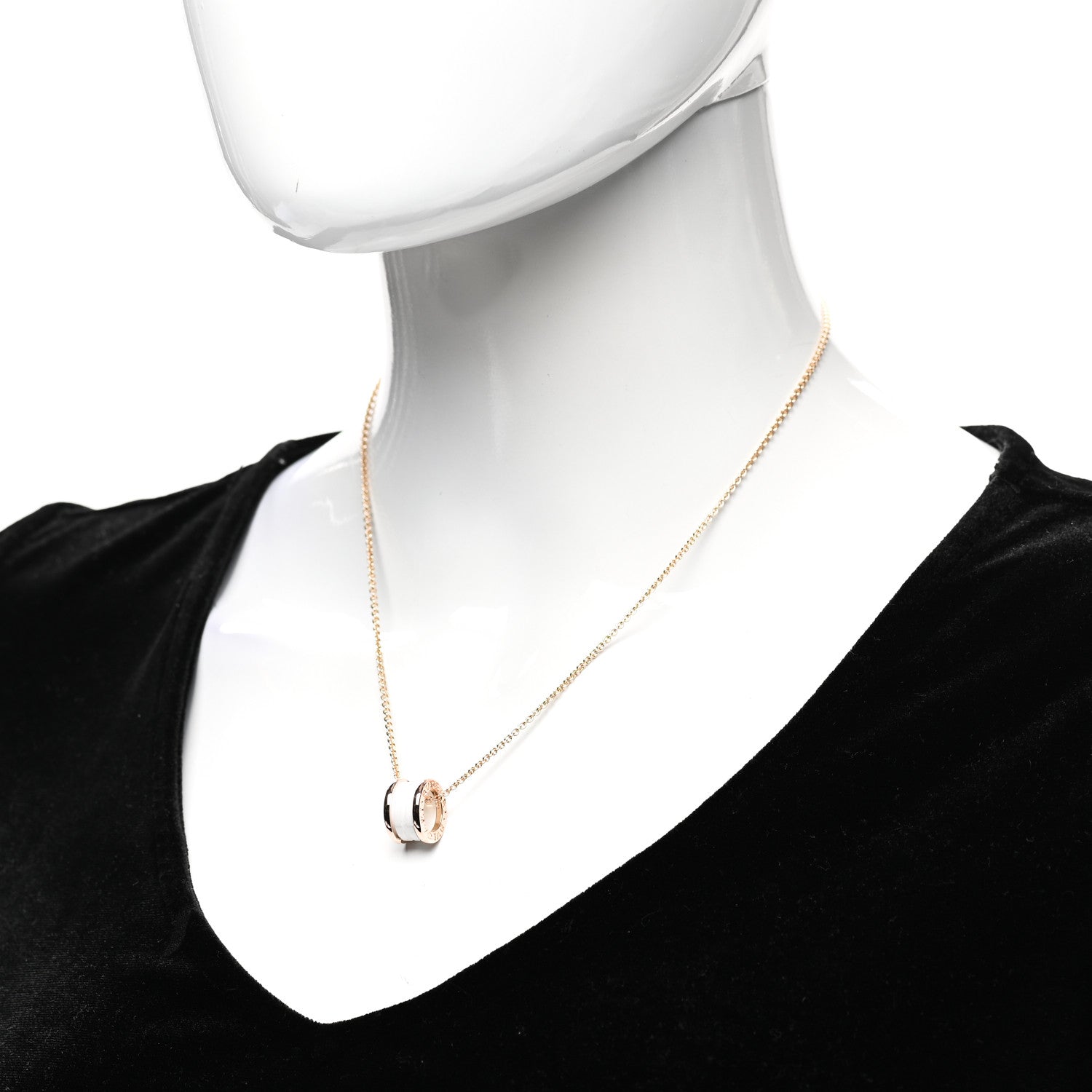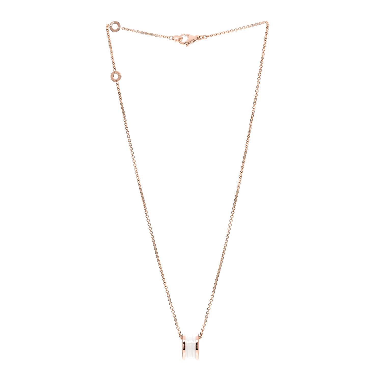 This is an authentic BULGARI 18K Rose Gold White Ceramic B.Zero1 Pendant Necklace. The necklace is crafted of 18 karat rose gold and features the signature white ceramic B.Zero barrel motif framed by the BVLGARI logo on either side.Follow this item for alerts. Bulgari is a registered trademark of Bulgari. FASHIONPHILE is not affiliated with Bulgari.