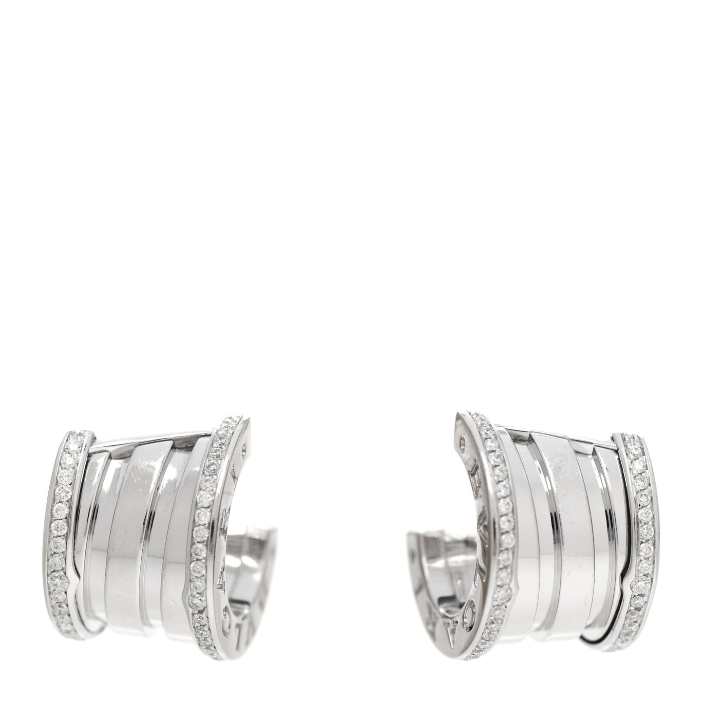 This is an authentic pair of BULGARI 18K White Gold Diamond B.Zero1 Hoop Earrings. The earrings are crafted of 18 karat white gold and feature the iconic barrel motif lined with sparkling diamonds, approximately .28 total carat weight.Follow this item for alerts. Bulgari is a registered trademark of Bulgari. FASHIONPHILE is not affiliated with Bulgari.