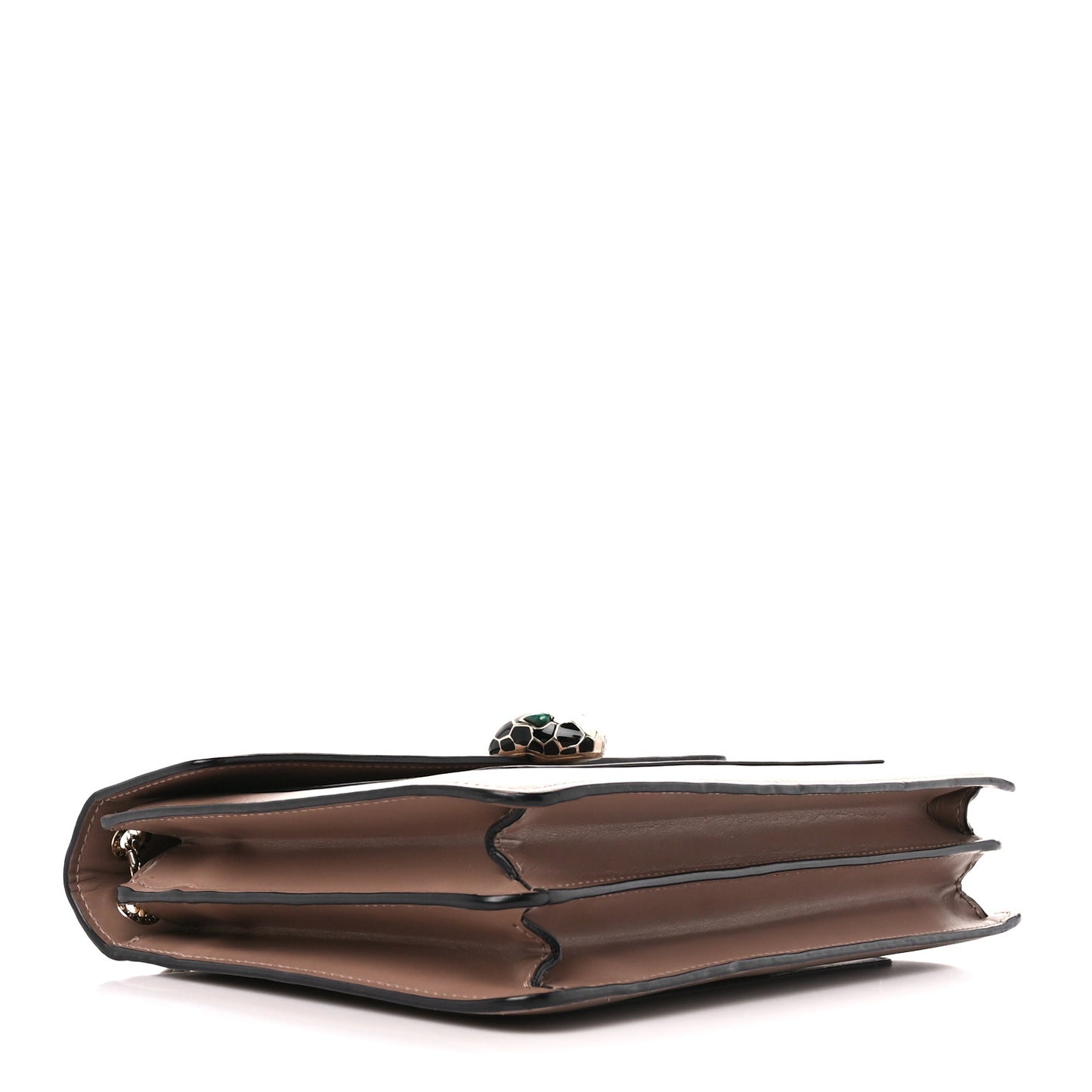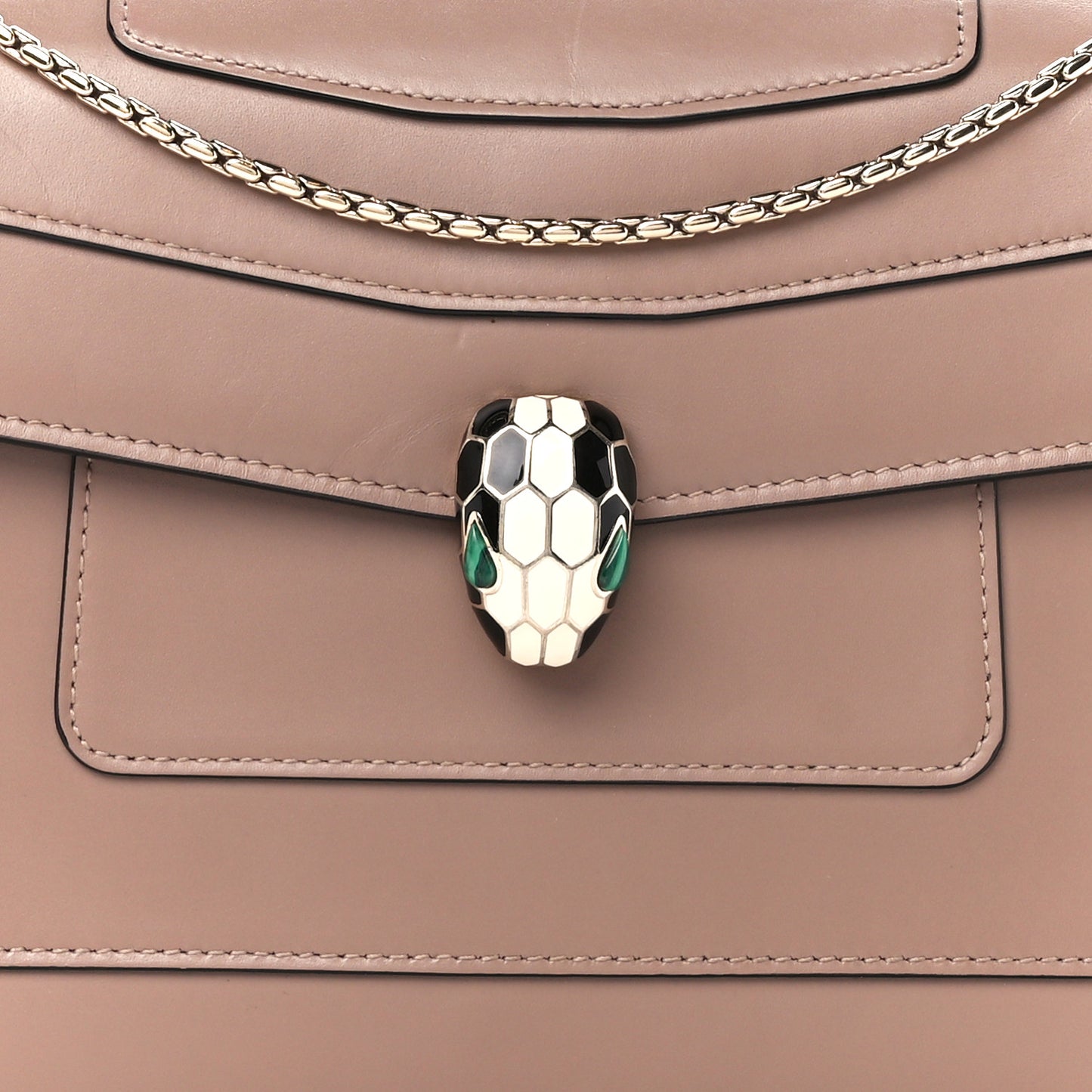This is an authentic BULGARI Calfskin Serpenti Forever Crossbody Bag in Beige. This striking bag is crafted of calfskin leather in beige and features a front flap with an enameled snake head closure, and gold hardware. The flap opens to a portioned burgundy fabric interior with a small patch pocket.Follow this item for alerts. Bulgari is a registered trademark of Bulgari. FASHIONPHILE is not affiliated with Bulgari.