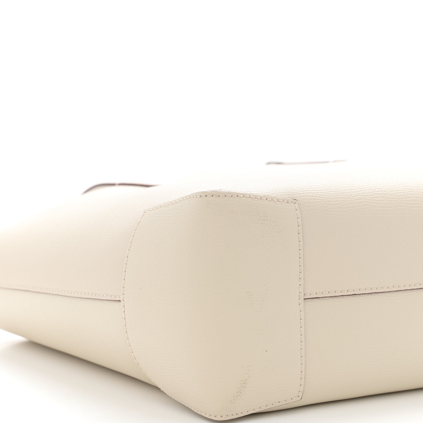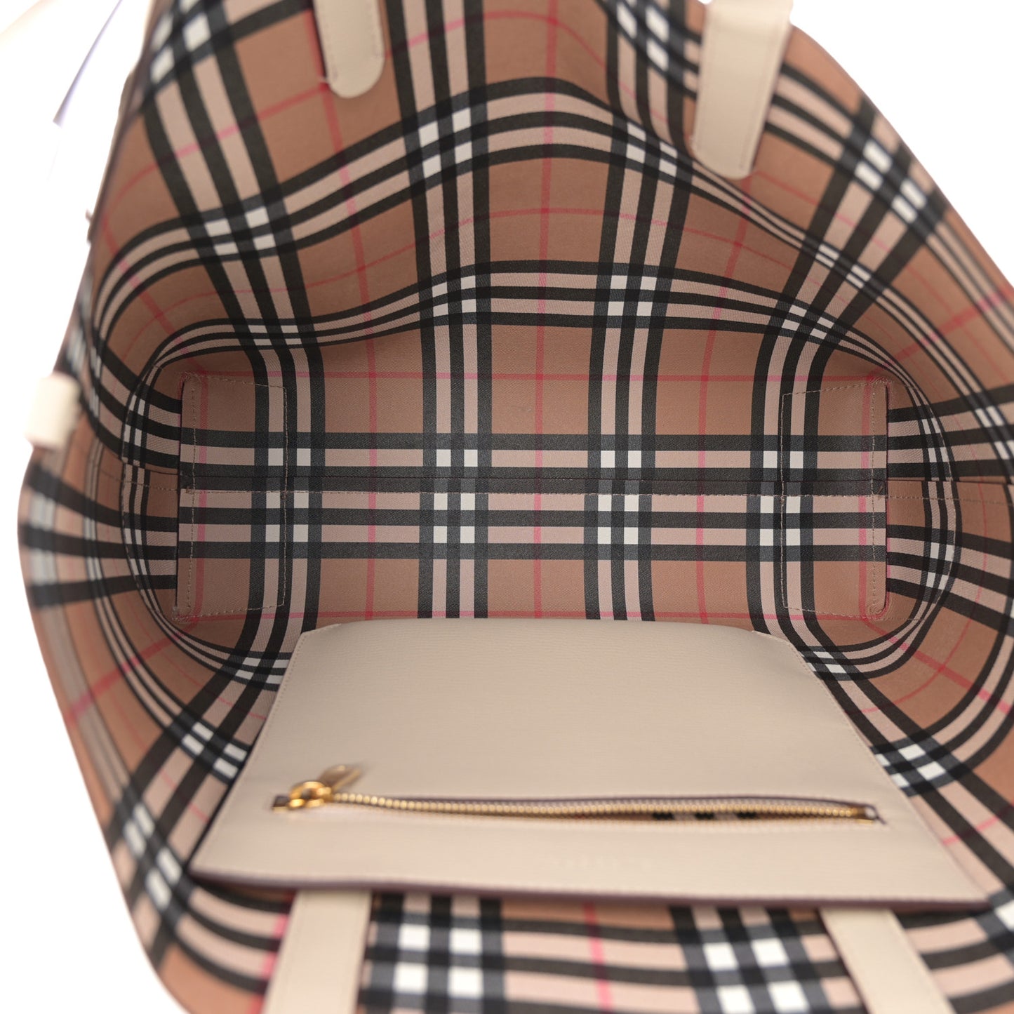 This is an authentic BURBERRY Calfskin Crest Embossed Small Tote in Limestone. This stylish shoulder bag is crafted of white calfskin leather with a bold Burberry embossed crest. The bag features tall leather shoulder straps and a broad open top. The top is open to a check canvas interior.