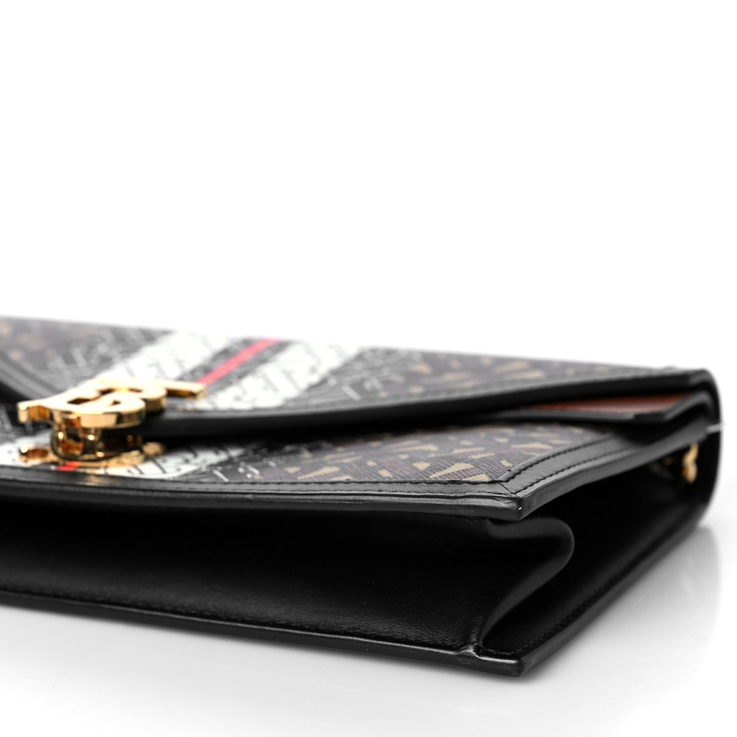 This is an authentic BURBERRY E-Canvas Monogram Stripe Small TB Envelope Clutch in Bridle Brown. This stylish bag is crafted of check-printed canvas and calfskin leather. The bag features a leather crossbody shoulder strap. The front flap features a gold press lock and opens to a black leather interior with a zipper a pocket.Follow this item for alerts. Burberry is a registered trademark of Burberry. FASHIONPHILE is not affiliated with Burberry.