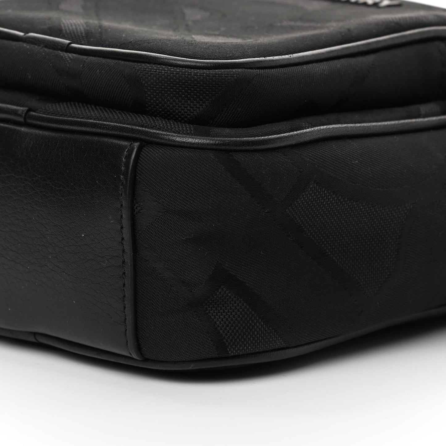 This is an authentic BURBERRY Jacquard Logo TB Crossbody Bag in Black. This bag is a stylishly structured bag crafted of black fabric and leather trim. It features an adjustable shoulder strap, black hardware, and a top zipper that opens to a black fabric interior.