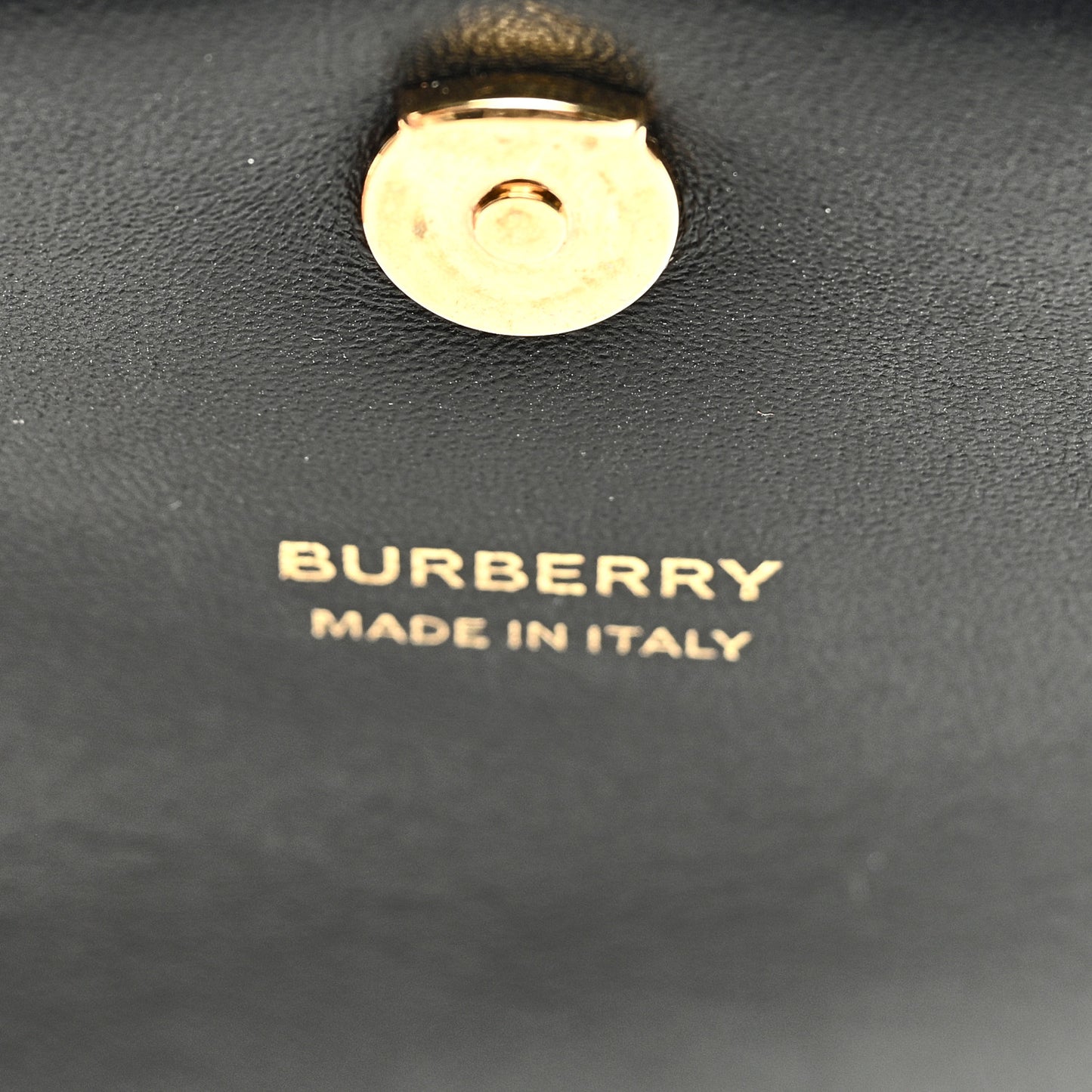 This is an authentic BURBERRY Lambskin Quilted Micro Lola Bag in Black. This stylish bag is crafted of quilted lambskin in black. The bag features a removable gold chain shoulder strap, a rear belt loop, and a front flap with a gold BT logo. This opens to a classic black fabric and leather interior with card slots.