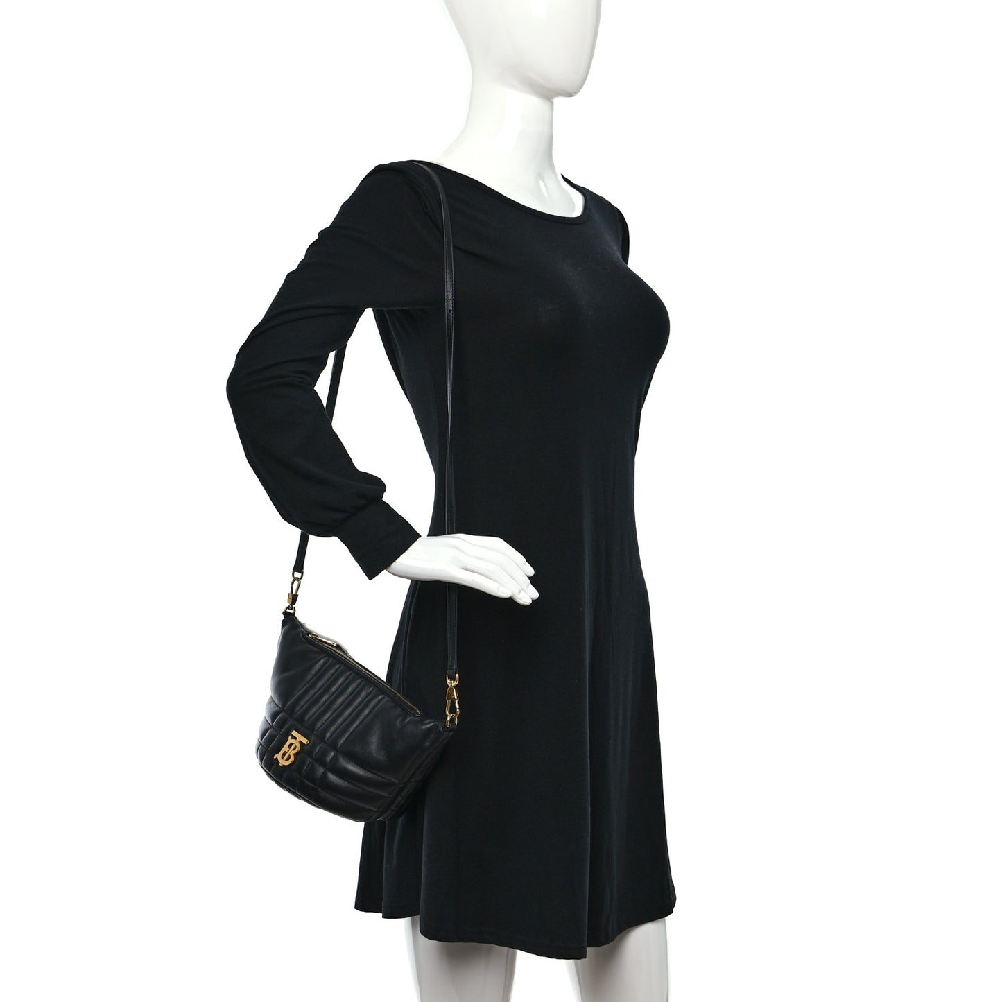 This is an authentic BURBERRY Lambskin Quilted Small Crescent Lola Bag in Black. This bag is crafted of lambskin leather in black. The bag features a black leather shoulder strap and a TB logo. The top zipper opens to a black nylon interior.Follow this item for alerts. Burberry is a registered trademark of Burberry. FASHIONPHILE is not affiliated with Burberry.