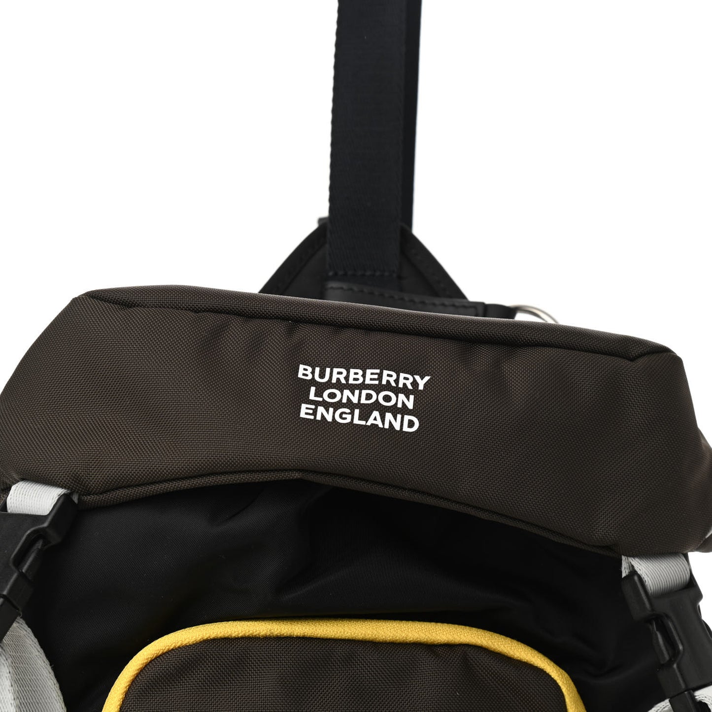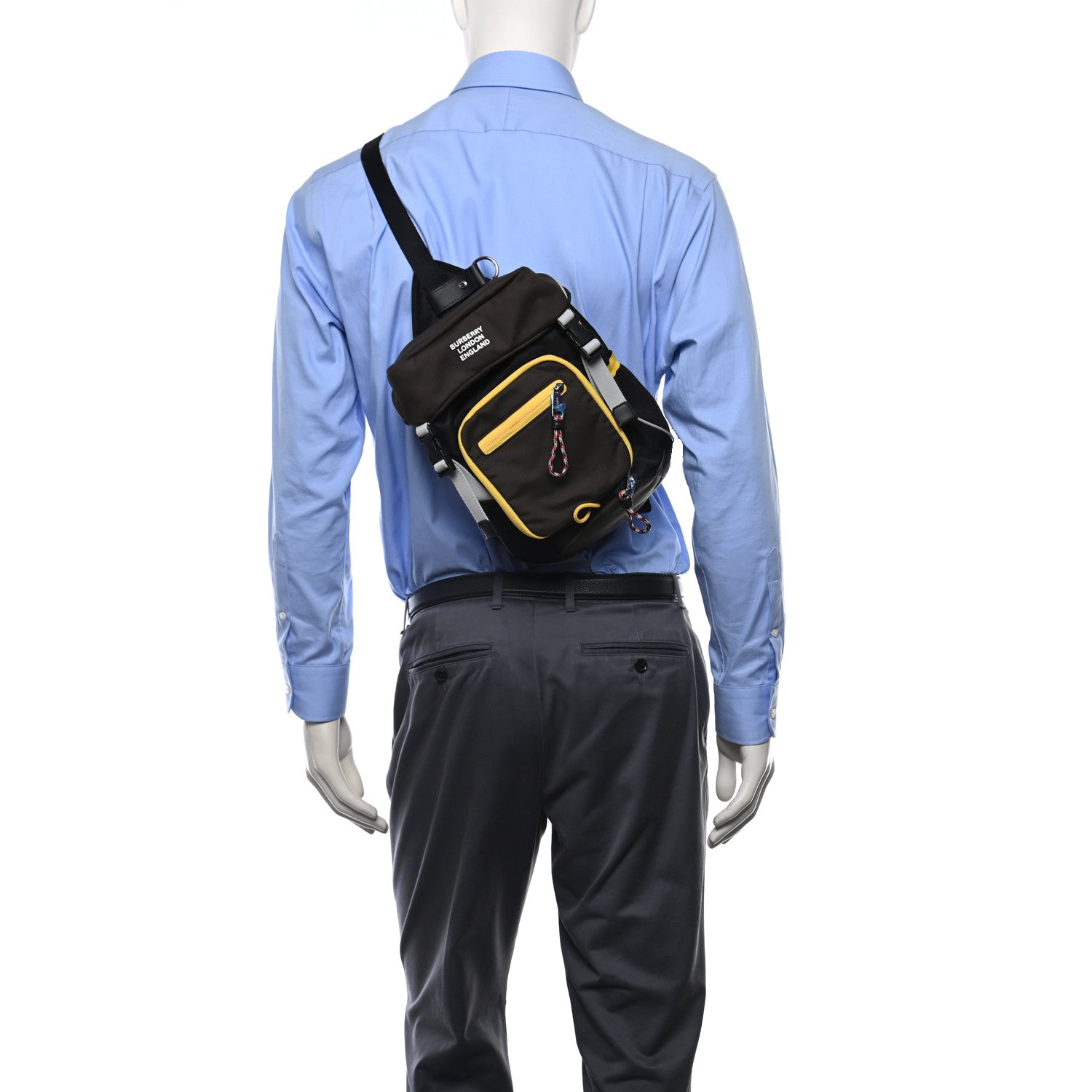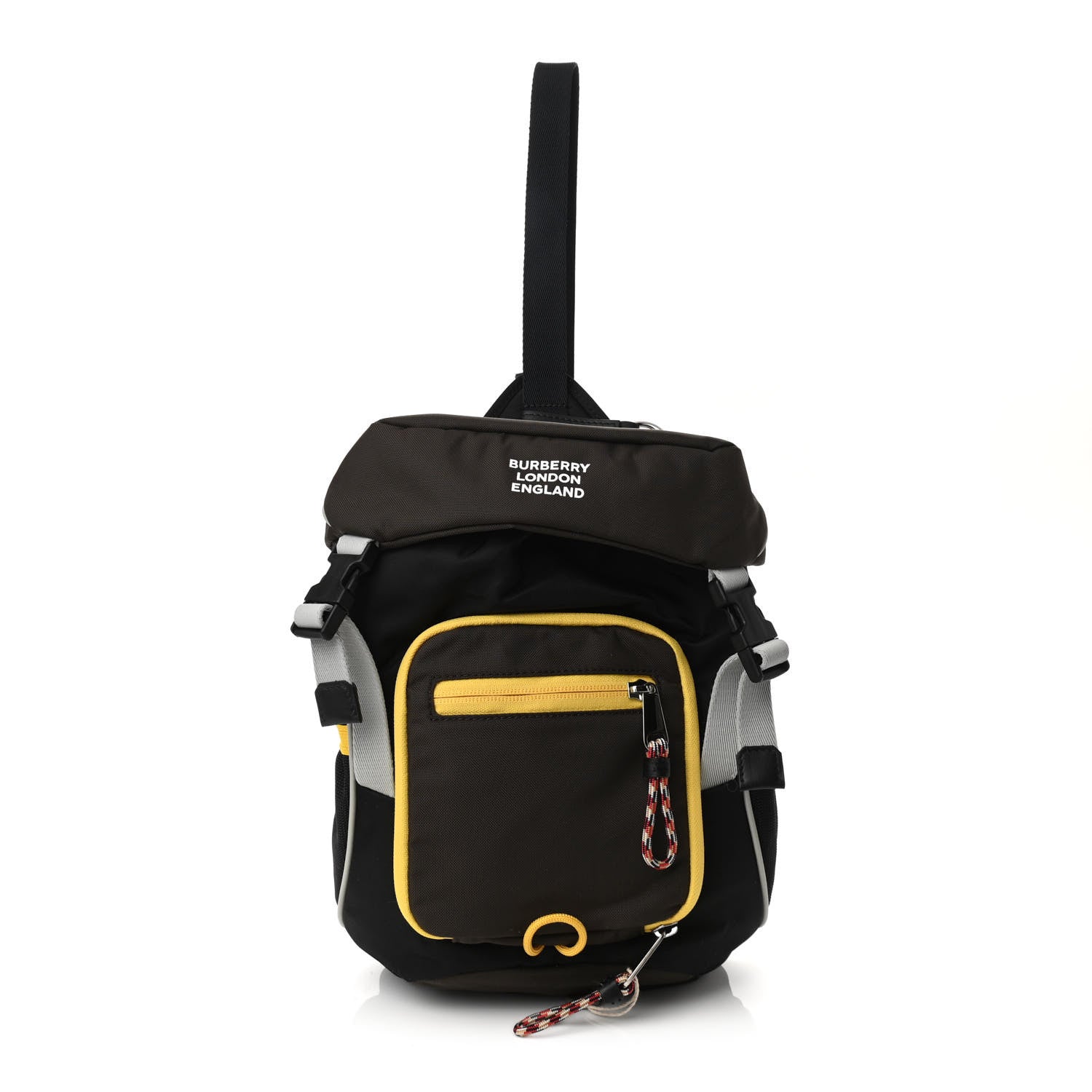 This is an authentic BURBERRY Nylon Medium Leo Sling Bag in Black, Yellow, and Grey. This chic backpack is crafted of nylon canvas in black, grey, and yellow with matching calfskin trim. The bag features an adjustable shoulder strap, a front pocket, two side pockets, and polished silver hardware. The top opens to a black nylon interior with a zipper pocket.Follow this item for alerts. Burberry is a registered trademark of Burberry. FASHIONPHILE is not affiliated with Burberry.