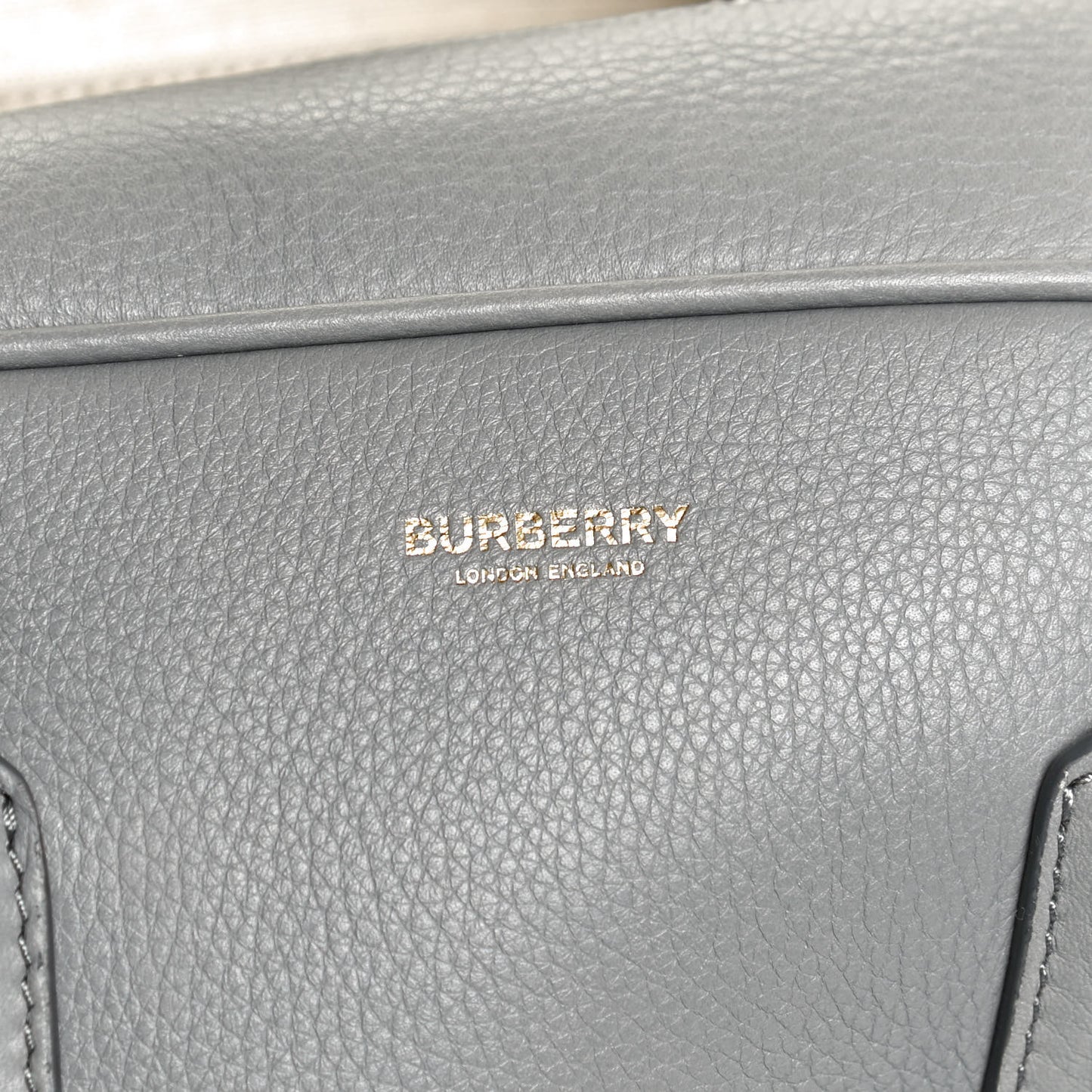 This is an authentic BURBERRY Soft Grain Calfskin Half Cube Bag in Bright Cloud Grey. This chic bowling bag is crafted of leather. The bag features rolled leather top handles with polished silver hardware. This opens to a beige fabric interior with a leather pocket.