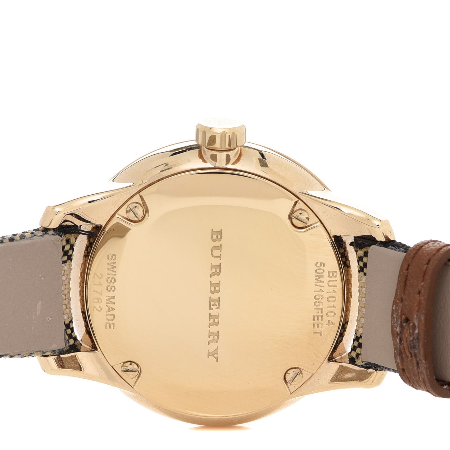 This is an authentic BURBERRY Stainless Steel Canvas 32mm BU10104 Quartz Watch Brown. The watch is crafted of gold plated stainless steel and features a gold dial, gold hands and hour markers, date display, checked calfskin strap, sapphire crystal, and a quartz movement.Follow this item for alerts. Burberry is a registered trademark of Burberry. FASHIONPHILE is not affiliated with Burberry.