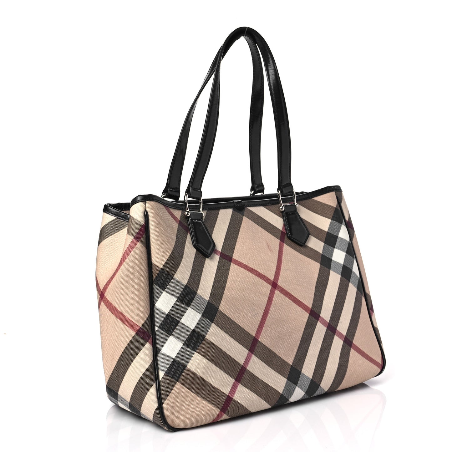 This is an authentic BURBERRY Supernova Check Tote in Black. This stylish shoulder bag is crafted of classic Supernova check coated canvas. The tote features black patent leather top handles and trims with polished dark silver hardware. The top zipper opens to a beige fabric interior with zipper and patch pockets.Follow this item for alerts. Burberry is a registered trademark of Burberry. FASHIONPHILE is not affiliated with Burberry.