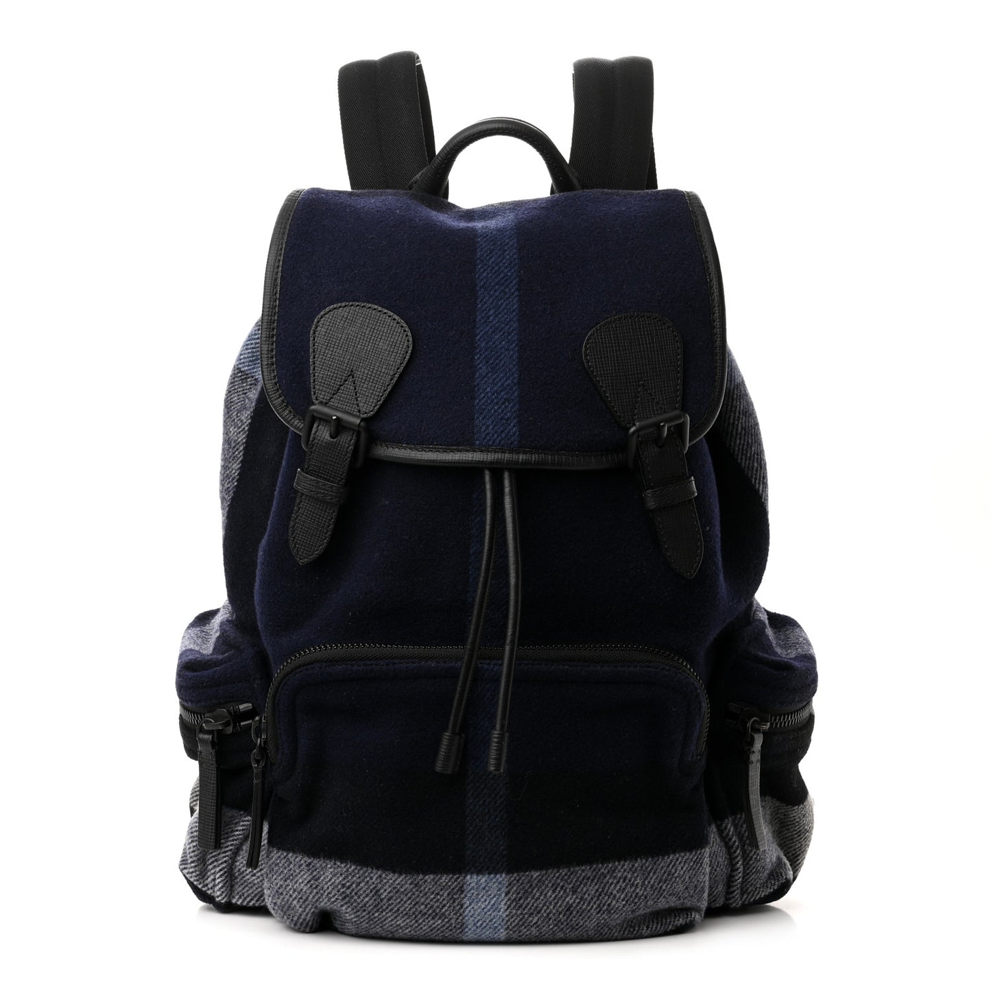 This is an authentic BURBERRY Wool Check Duffle Rucksack Backpack in Indigo Blue. This chic backpack is crafted of wool in the signature Burberry check in blue. The bag features adjustable nylon and leather shoulder straps, a black padded back, a front and two side zipper pockets, and black leather trim including a rolled leather top handle with matte black hardware. The flap opens to a wool interior with zipper and patch pockets.Follow this item for alerts. Burberry is a registered trademark of Burberry. FASHIONPHILE is not affiliated with Burberry.