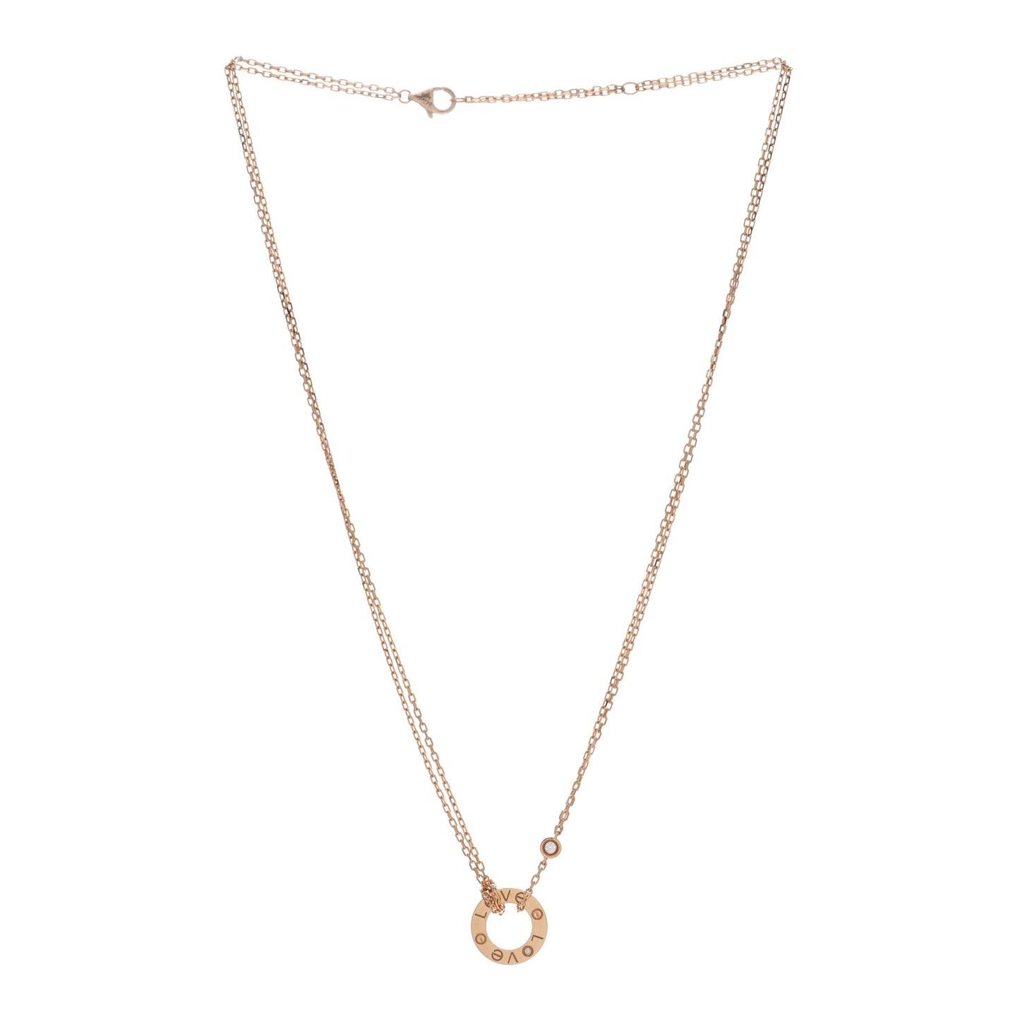 This is an authentic CARTIER 18K Pink Gold 2 Diamond LOVE Necklace. The necklace is crafted of 18 karat pink gold and features a ring motif pendant engraved with the signature Cartier LOVE screw motifs and two round brilliant cut diamonds, approximately .03 total carat weight.Follow this item for alerts. Cartier is a registered trademark of Cartier. FASHIONPHILE is not affiliated with Cartier.