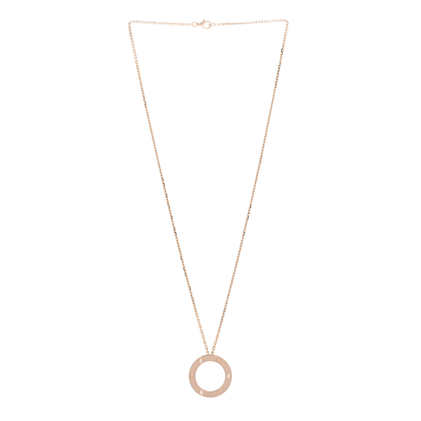 This is an authentic CARTIER 18K Pink Gold 3 Diamonds LOVE Pendant Necklace. The necklace is crafted of 18 karat pink gold and features a circular pendant with the engraved Cartier LOVE screw symbol motifs alternating between three round brilliant cut diamonds, approximately .07 total carat weight.Follow this item for alerts. Cartier is a registered trademark of Cartier. FASHIONPHILE is not affiliated with Cartier.
