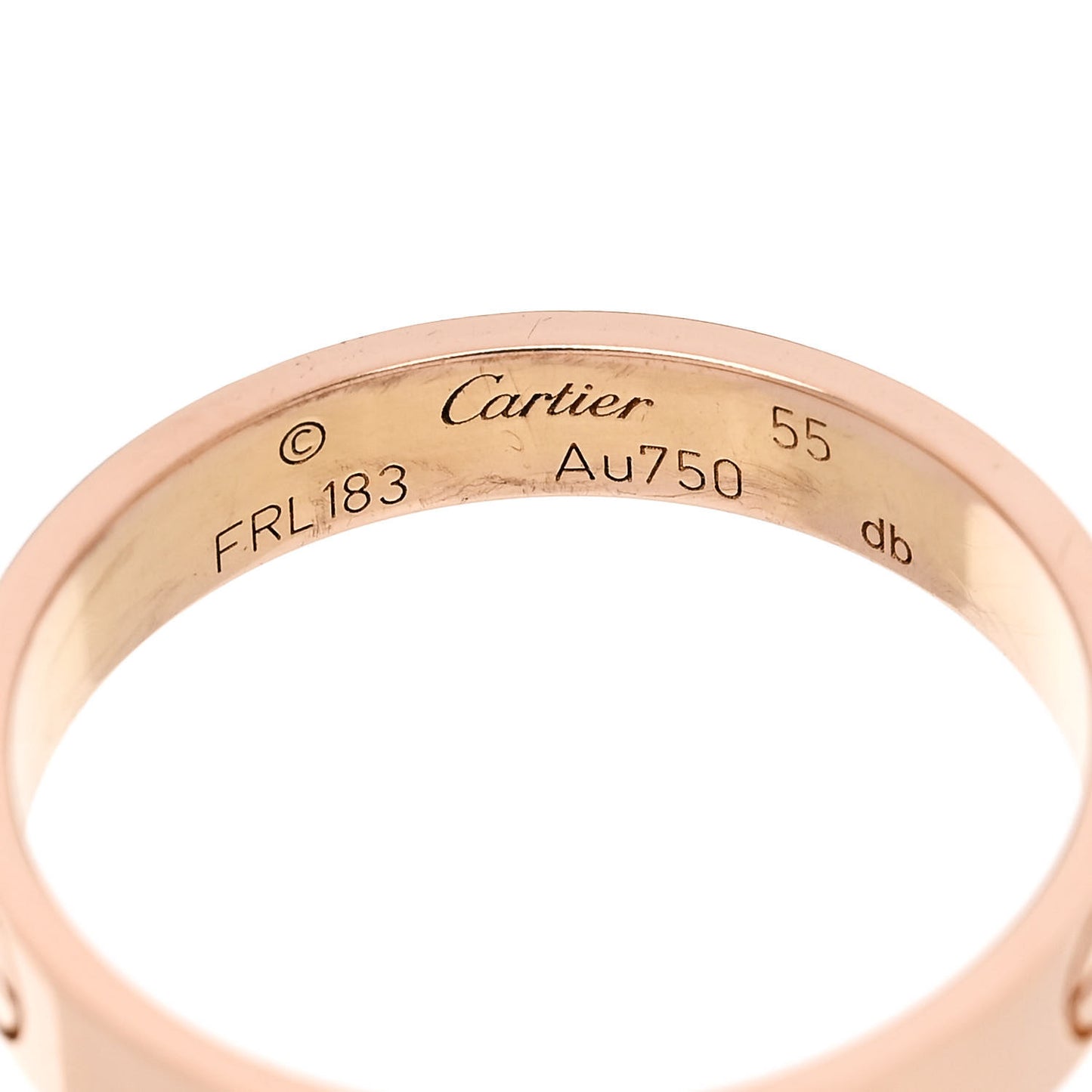 This is an authentic CARTIER 18K Pink Gold 3.5mm LOVE Wedding Band Ring size 55 or 7.25. The ring is crafted of 18 karat pink gold and features the LOVE symbol motif engraved throughout the band.Follow this item for alerts. Cartier is a registered trademark of Cartier. FASHIONPHILE is not affiliated with Cartier.