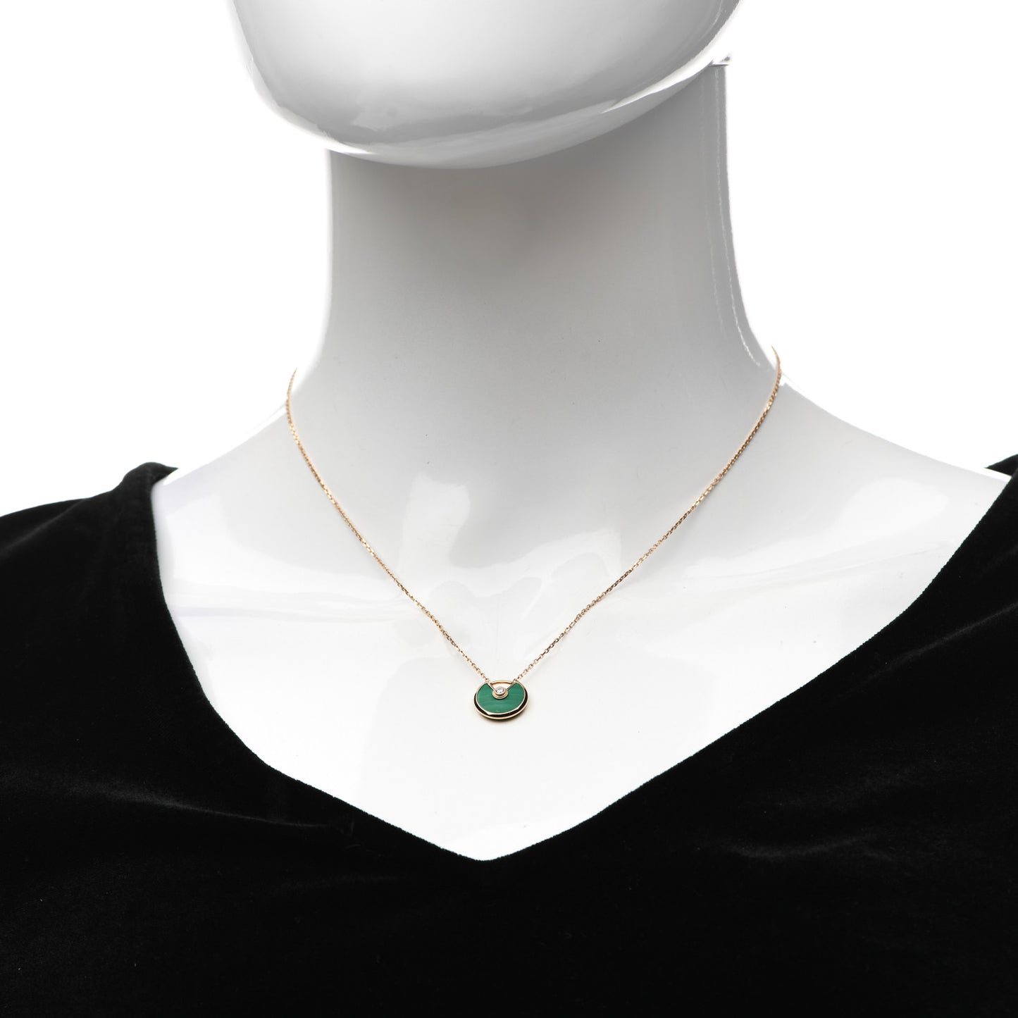 This is an authentic CARTIER 18K Pink Gold Diamond Malachite XS Amulette de Cartier Pendant Necklace. The necklace is crafted of 18 karat pink gold and features an amulet pendant set with green malachite and a single round brilliant cut diamond weighing approximately .03 total carat weight.Follow this item for alerts. Cartier is a registered trademark of Cartier. FASHIONPHILE is not affiliated with Cartier.