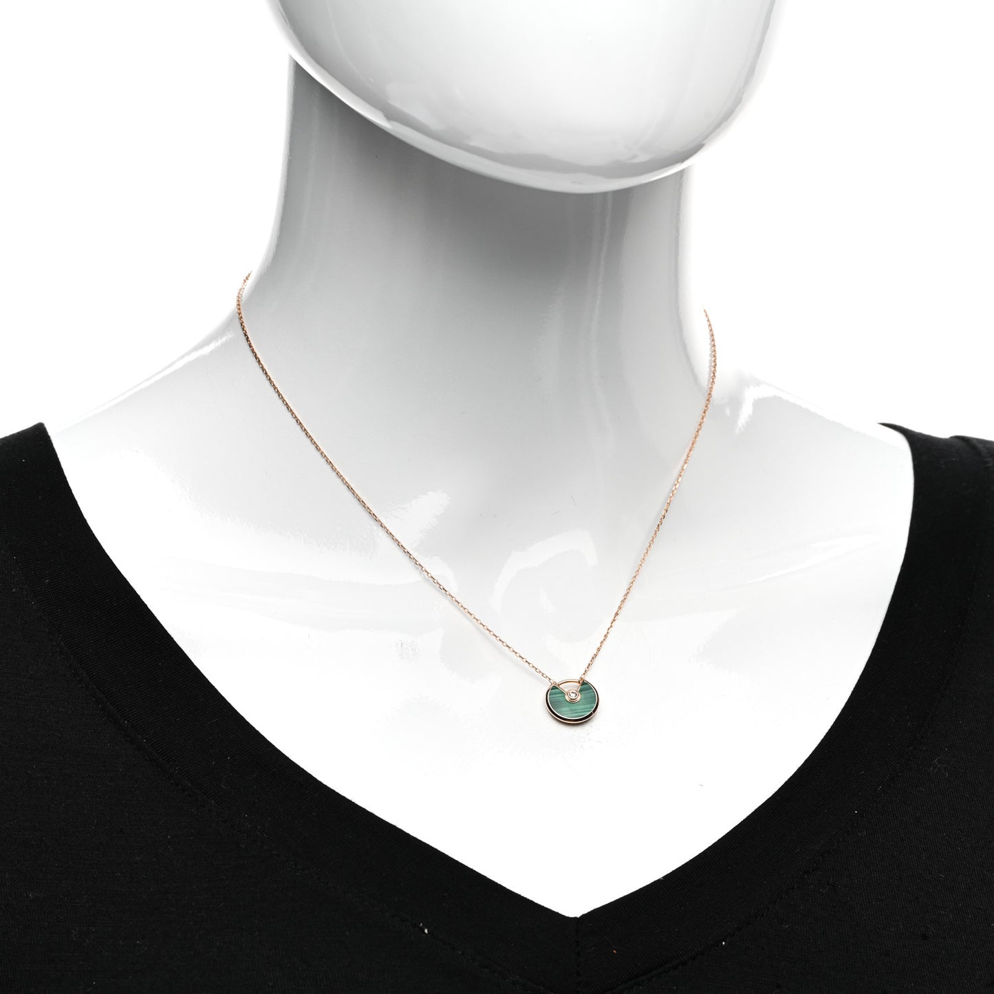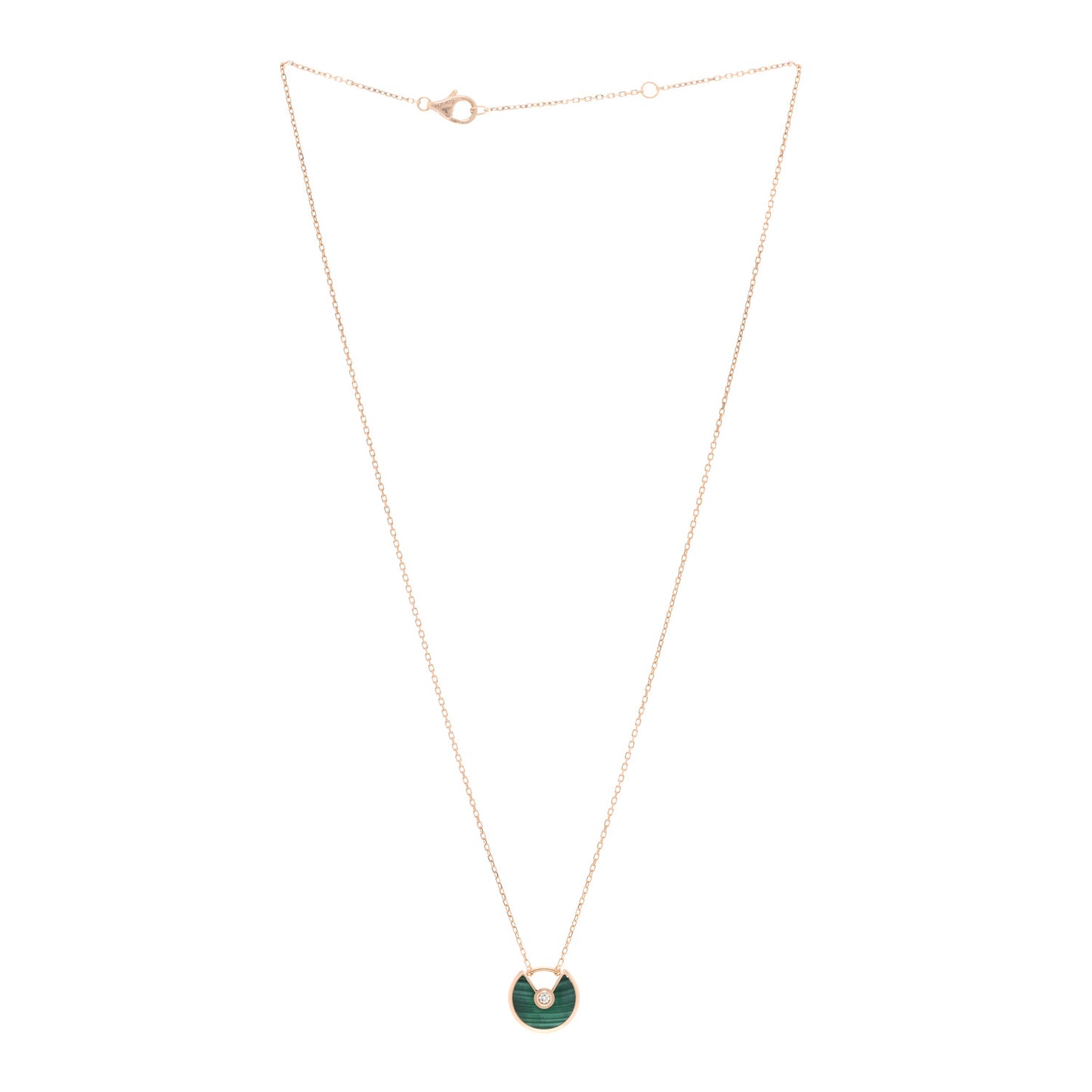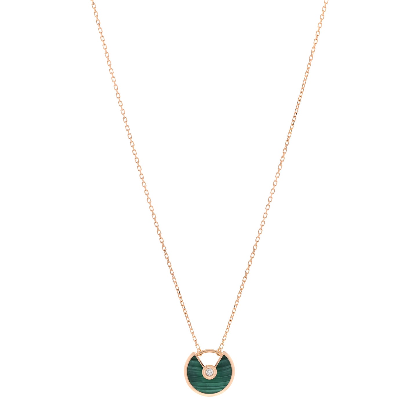 This is an authentic CARTIER 18K Pink Gold Diamond Malachite XS Amulette de Cartier Pendant Necklace. The necklace is crafted of 18-karat pink gold and features a round pendant set with malachite and a single round brilliant cut diamond weighing approximately .02 carat.Follow this item for alerts. Cartier is a registered trademark of Cartier. FASHIONPHILE is not affiliated with Cartier.