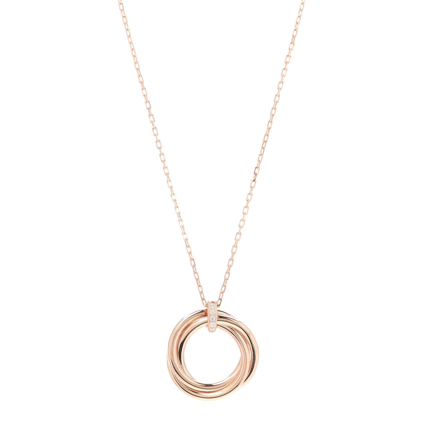 This is an authentic CARTIER 18K Pink Gold Diamond Trinity Pendant Necklace. The necklace is crafted of 18 karat pink gold and features three interlocking bands accented with a diamond bail, approximately .03 total carat weight.Follow this item for alerts. Cartier is a registered trademark of Cartier. FASHIONPHILE is not affiliated with Cartier.