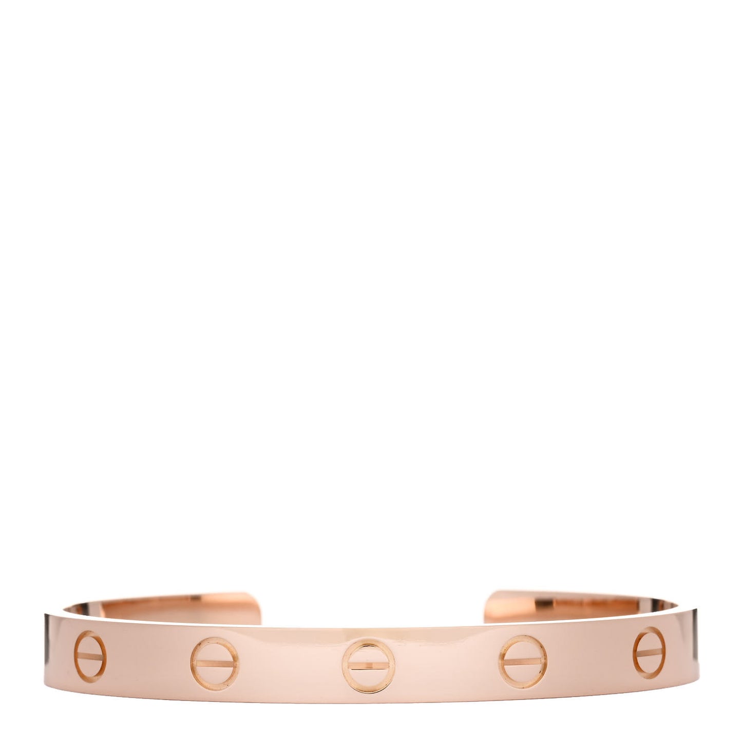 This is an authentic CARTIER 18K Pink Gold LOVE Cuff Bracelet size 16. The bracelet is crafted of 18 karat pink gold and features an open cuff with the signature LOVE screw motifs engraved throughout.Follow this item for alerts. Cartier is a registered trademark of Cartier. FASHIONPHILE is not affiliated with Cartier.