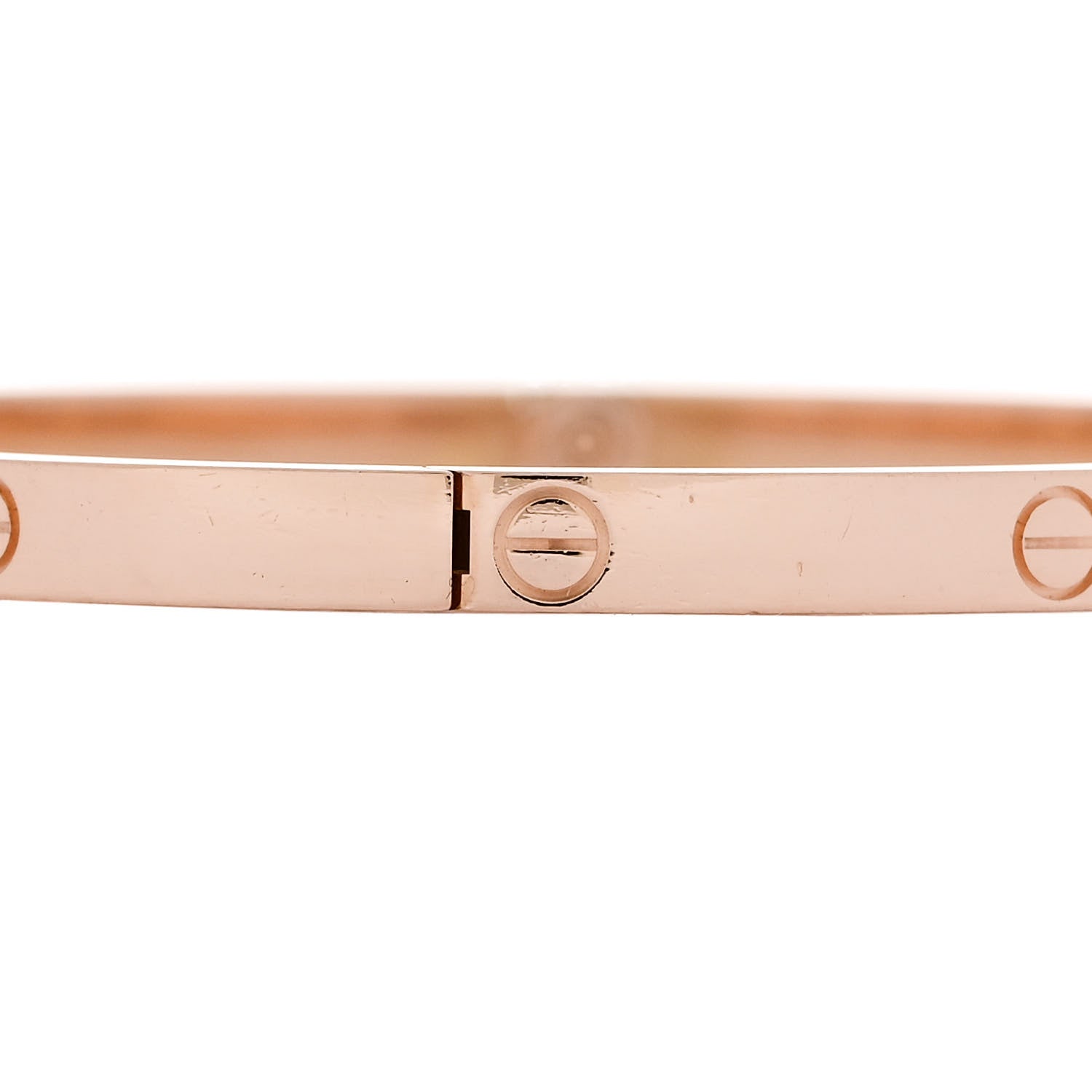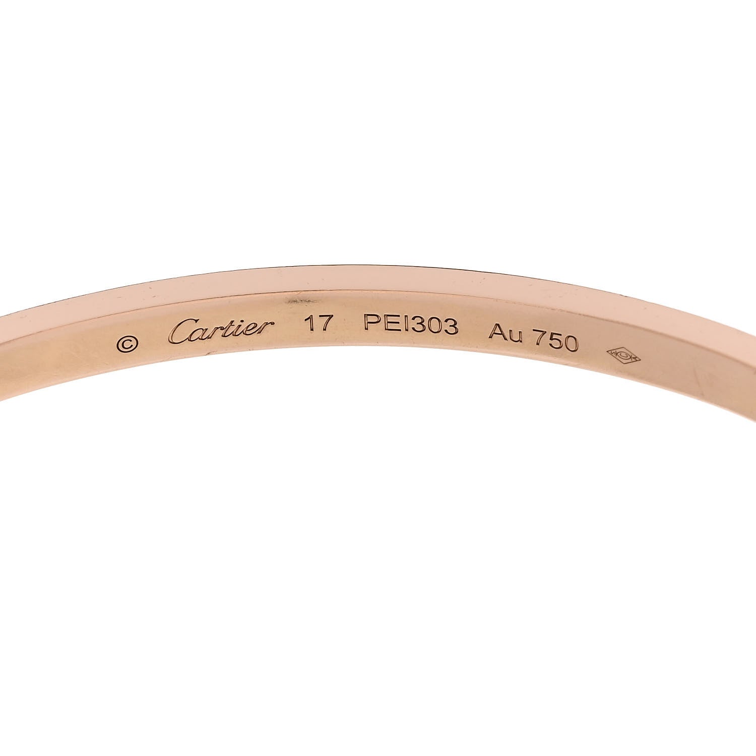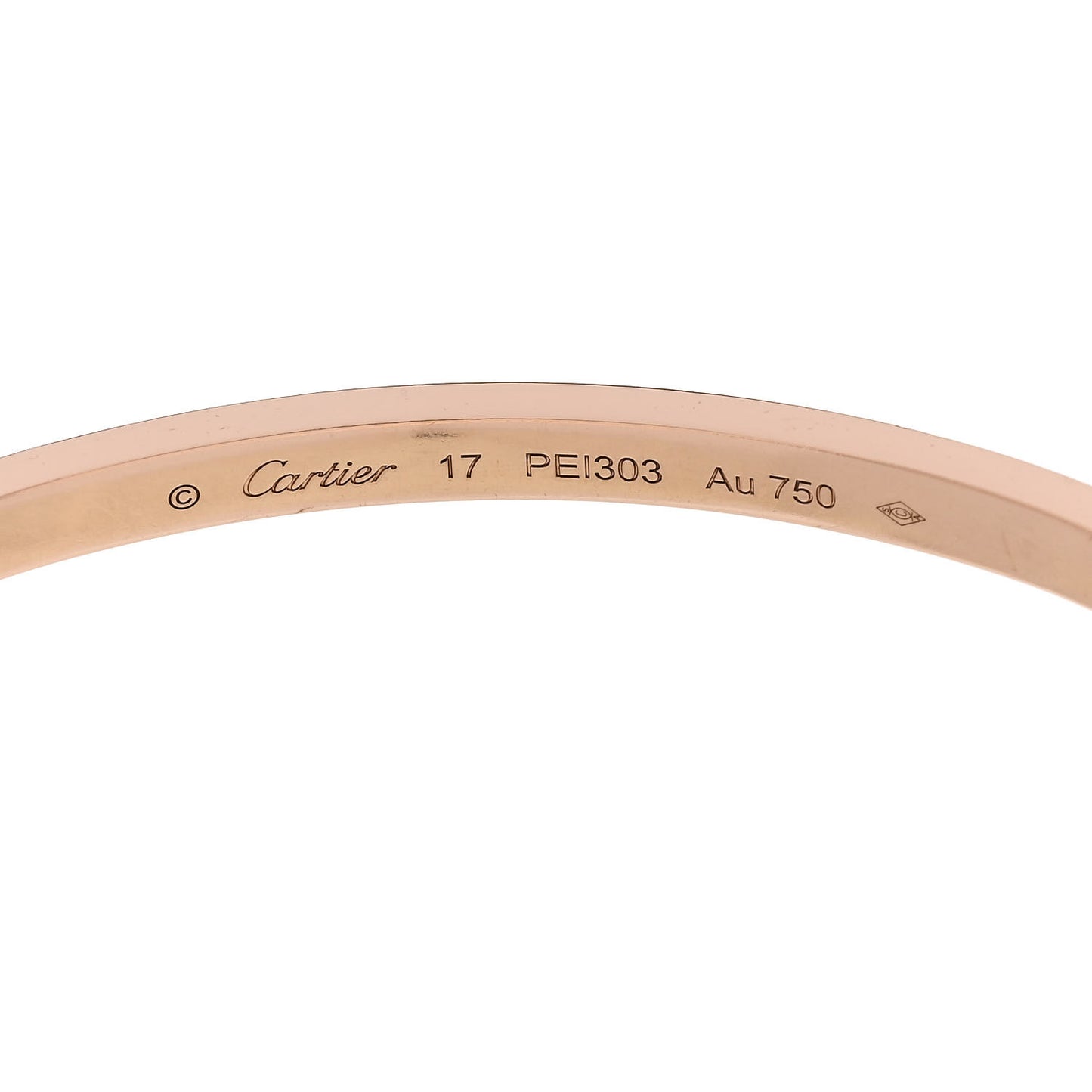 This is an authentic CARTIER 18K Pink Gold Small LOVE Bracelet size 17. The bracelet is crafted of 18 karat pink gold and features the signature LOVE screw motif engraved throughout a hinged bangle.Follow this item for alerts. Cartier is a registered trademark of Cartier. FASHIONPHILE is not affiliated with Cartier.