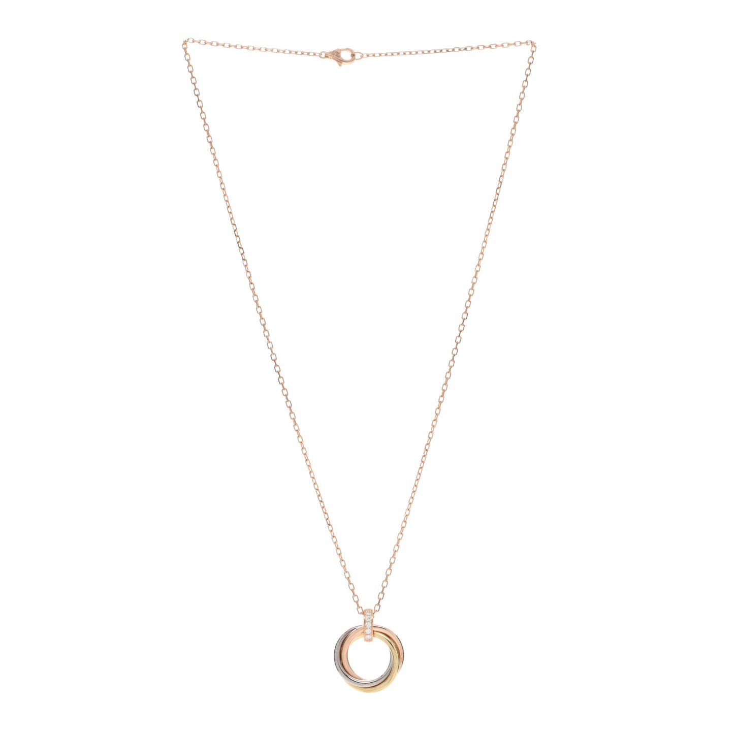 This is an authentic CARTIER 18K Pink White Yellow Gold Diamond Trinity Pendant Necklace. The necklace is crafted of 18 karat pink, white and yellow gold, and features three interlocking rings and a diamond accented bail, approximately .09 total carat weight.Follow this item for alerts. Cartier is a registered trademark of Cartier. FASHIONPHILE is not affiliated with Cartier.