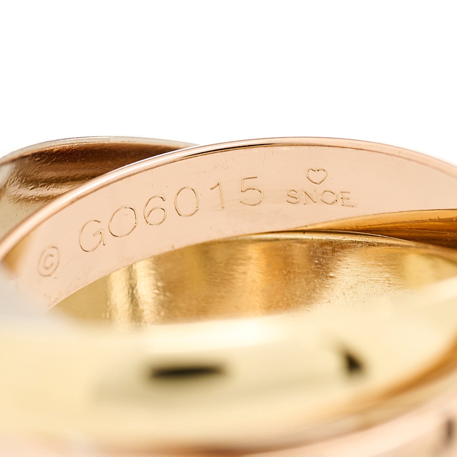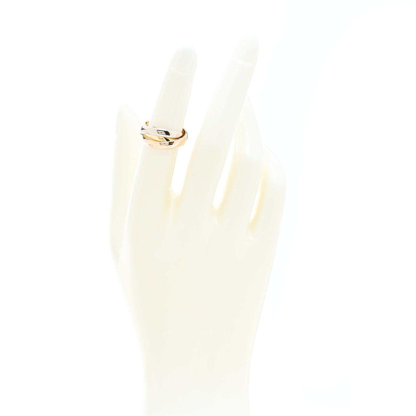 This is an authentic CARTIER 18K Pink Yellow White Gold Classic Trinity Ring size 49 or 4.75. The ring is crafted of 18 karat pink, yellow, and white gold and features the Cartier logo engraved in script.Follow this item for alerts. Cartier is a registered trademark of Cartier. FASHIONPHILE is not affiliated with Cartier.