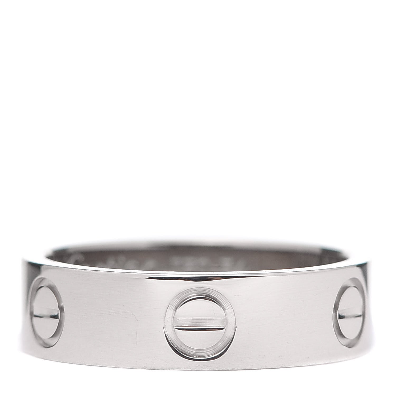This is an authentic CARTIER 18K White Gold 5.5mm LOVE Ring size 54 or 6.75. The ring is crafted of 18 karat white gold and features the engraved LOVE symbol motif throughout the band.Follow this item for alerts. Cartier is a registered trademark of Cartier. FASHIONPHILE is not affiliated with Cartier.