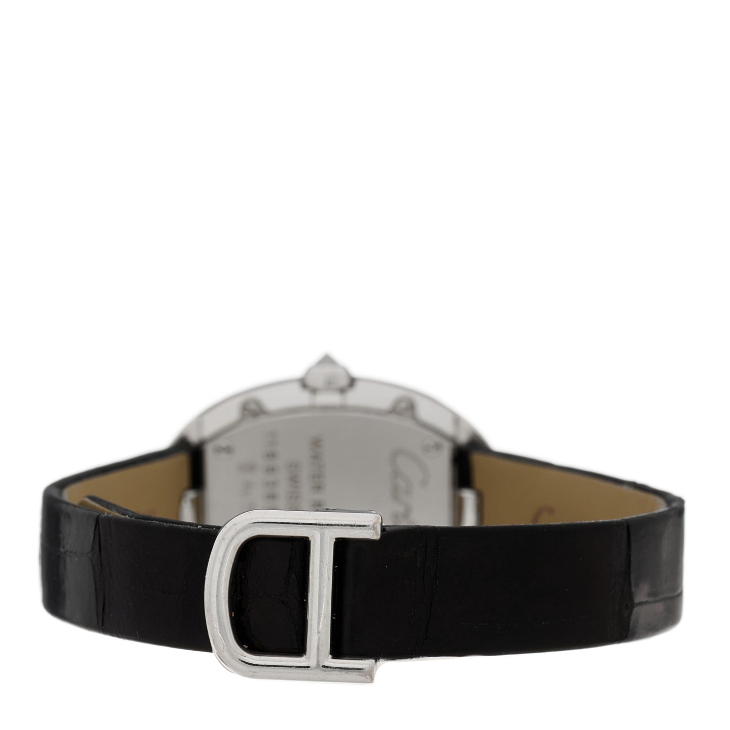 This is an authentic CARTIER 18K White Gold Alligator Diamond Bezel 24mm Baignoire Quartz Watch. The watch is crafted of 18 karat white gold and features a white dial with Roman numeral hour markers, diamond bezel approximately .50 total carat weight, black alligator strap, sapphire crystal, and a quartz movement.Follow this item for alerts. Cartier is a registered trademark of Cartier. FASHIONPHILE is not affiliated with Cartier.