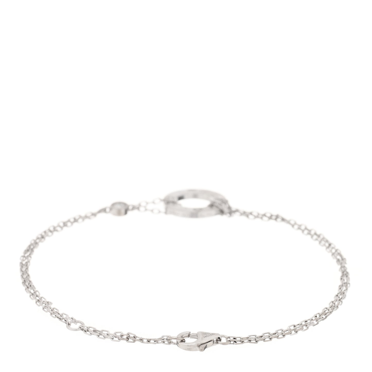 This is an authentic CARTIER 18K White Gold Diamond LOVE Bracelet. The bracelet is crafted of 18 karat white gold and features a double chain holding a center ring engraved with the LOVE screw symbol motifs and two round brilliant cut diamonds, approximately .03 total carat weight.Follow this item for alerts. Cartier is a registered trademark of Cartier. FASHIONPHILE is not affiliated with Cartier.