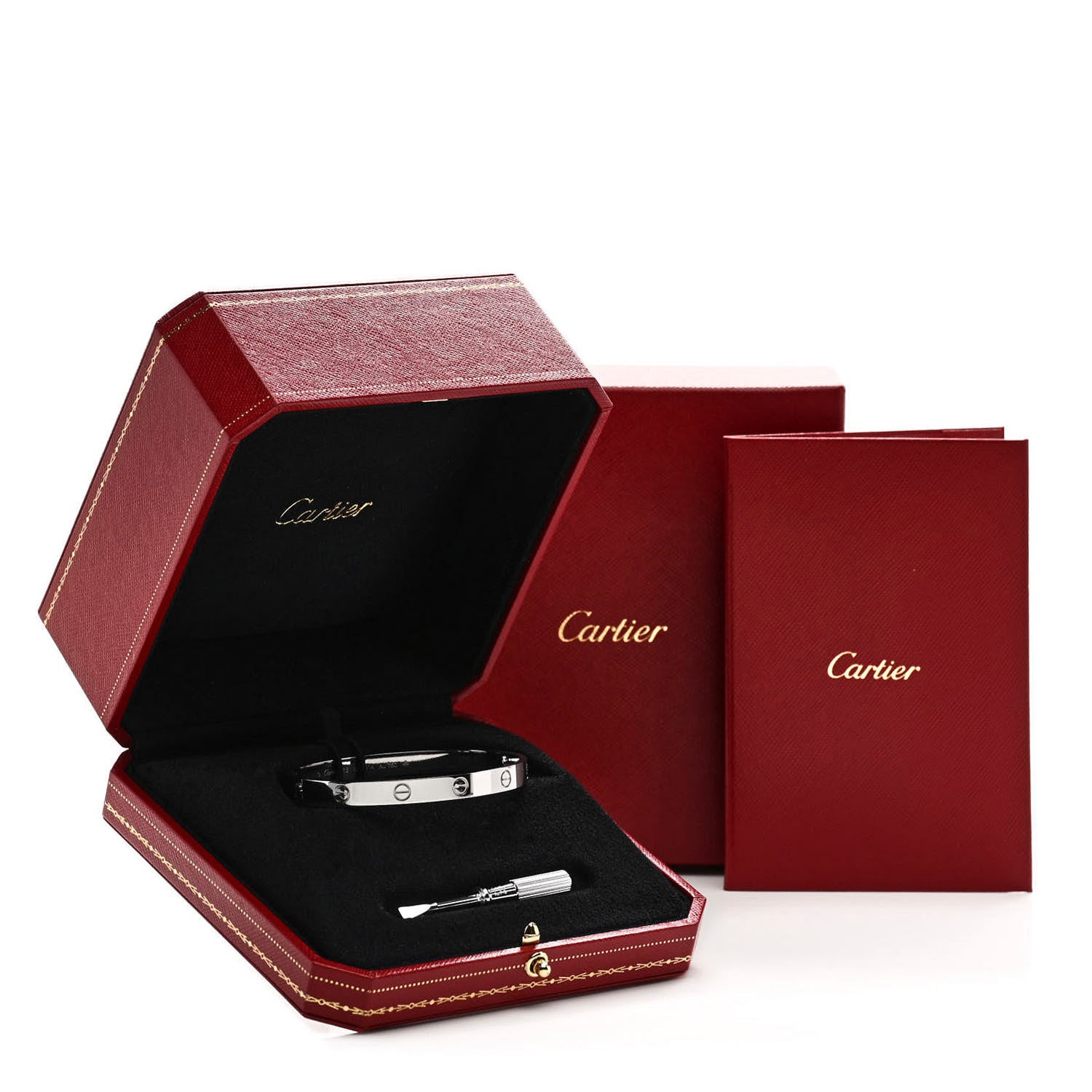 This is an authentic CARTIER 18K White Gold LOVE Bracelet size 17. The bracelet is crafted of 18 karat white gold and features the signature engraved LOVE screw motifs throughout the bangle. The bracelet also features the new Cartier screw system that prevents the loss of the screws when opening the bangle.Follow this item for alerts. Cartier is a registered trademark of Cartier. FASHIONPHILE is not affiliated with Cartier.