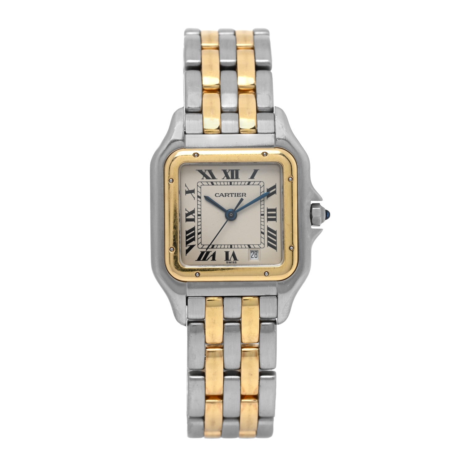 This is an authentic CARTIER Stainless Steel 18K Yellow Gold 27mm Panthere Quartz Watch. The watch is crafted of stainless steel and 18 karat yellow gold, and features an ivory dial with black Roman numeral hour markers, blue steel sword hands, date indicator, sapphire crystal, blue cabochon crown, two-tone link bracelet with hidden deployant clasp, and a quartz movement.Follow this item for alerts. Cartier is a registered trademark of Cartier. FASHIONPHILE is not affiliated with Cartier.
