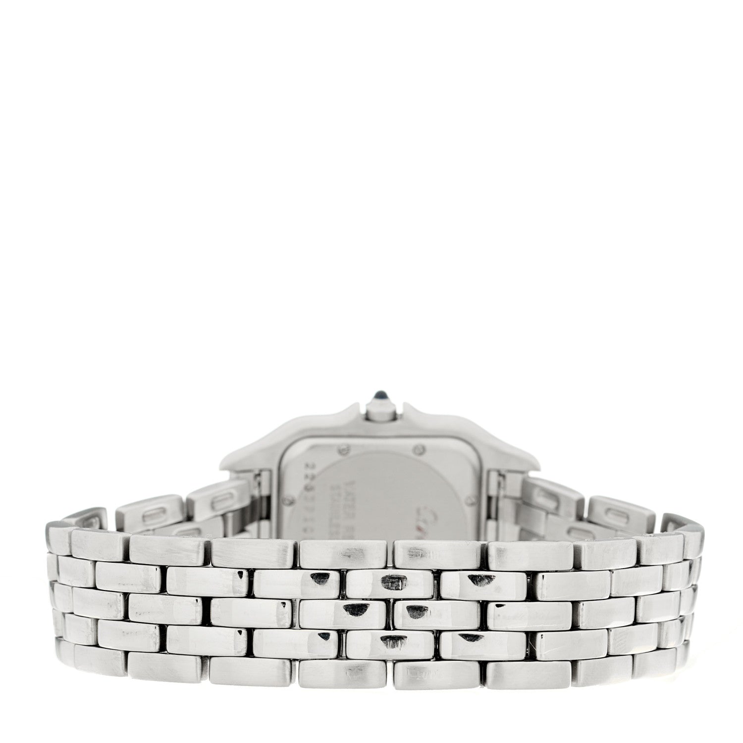 This is an authentic CARTIER Stainless Steel 27mm Panthere Quartz Watch. This watch is crafted of stainless steel and features a white dial, bold Roman numeral hour markers, blue sword hands, blue cabochon crown, date display, and a quartz movement.Follow this item for alerts. Cartier is a registered trademark of Cartier. FASHIONPHILE is not affiliated with Cartier.