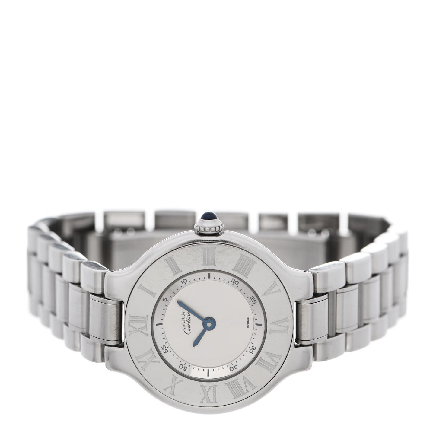 This is an authentic CARTIER Stainless Steel 28mm Must De 21 Quartz Watch. This Cartier Must De 21 features a quartz movement, silver dial, blue sword hands, Roman numeral engraved bezel, blue spinel cabochon, and link bracelet with double folding clasp.Follow this item for alerts. Cartier is a registered trademark of Cartier. FASHIONPHILE is not affiliated with Cartier.