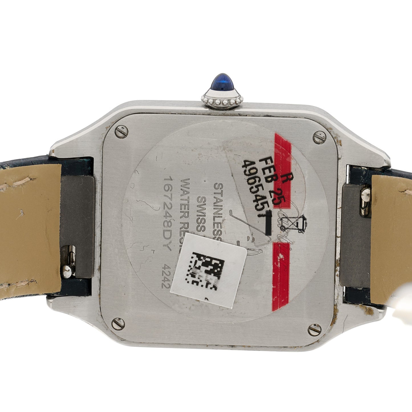 This is an authentic CARTIER Stainless Steel Alligator 27.5mm Santos Dumont Quartz Watch Blue. The watch is crafted of stainless steel and features a white dial with Roman numeral hour markers, sapphire crystal, blue spinel crown, navy alligator strap, and a quartz movement.Follow this item for alerts. Cartier is a registered trademark of Cartier. FASHIONPHILE is not affiliated with Cartier.