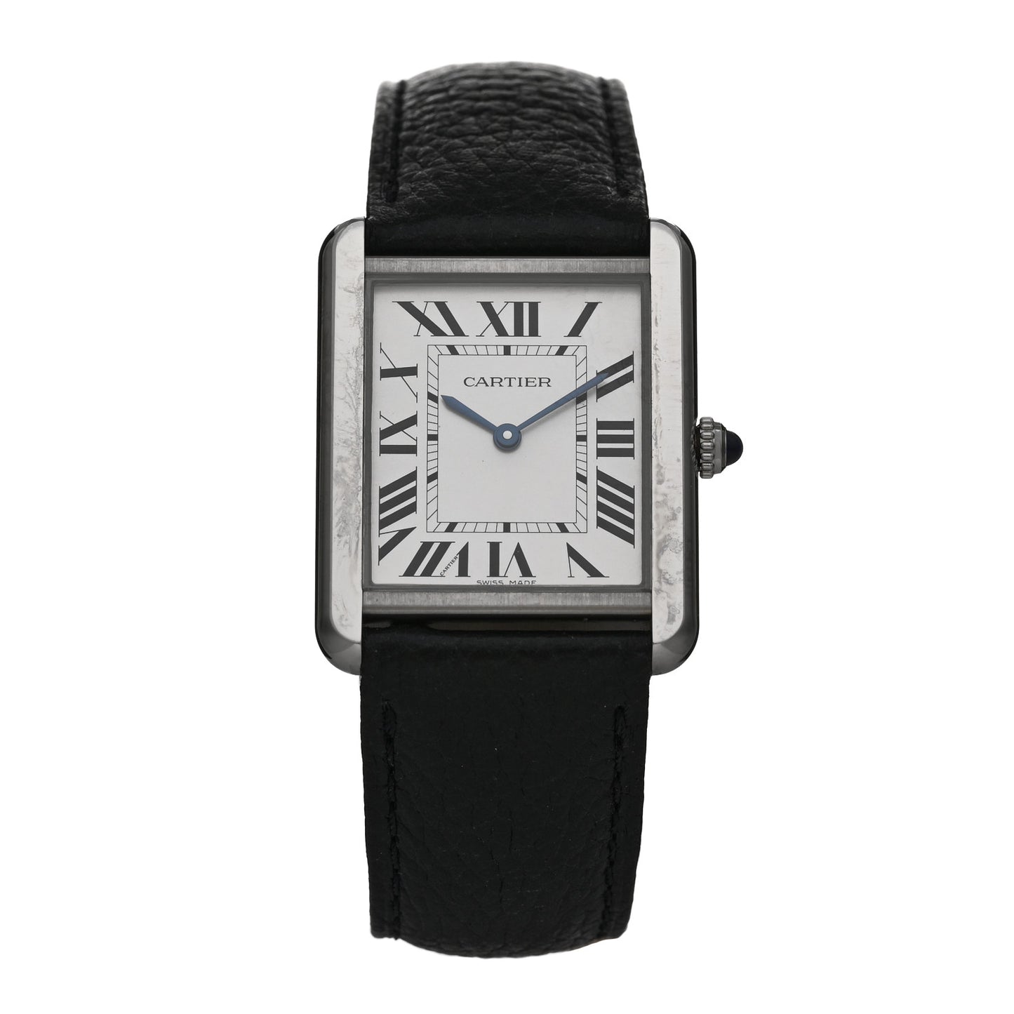 This is an authentic CARTIER Stainless Steel Calfskin 27mm Tank Solo Quartz Watch. This watch is crafted of stainless steel and features a white dial with Roman numeral hour markers, blue sword hands, black calfskin strap, sapphire crystal, and a quartz movement.Follow this item for alerts. Cartier is a registered trademark of Cartier. FASHIONPHILE is not affiliated with Cartier.