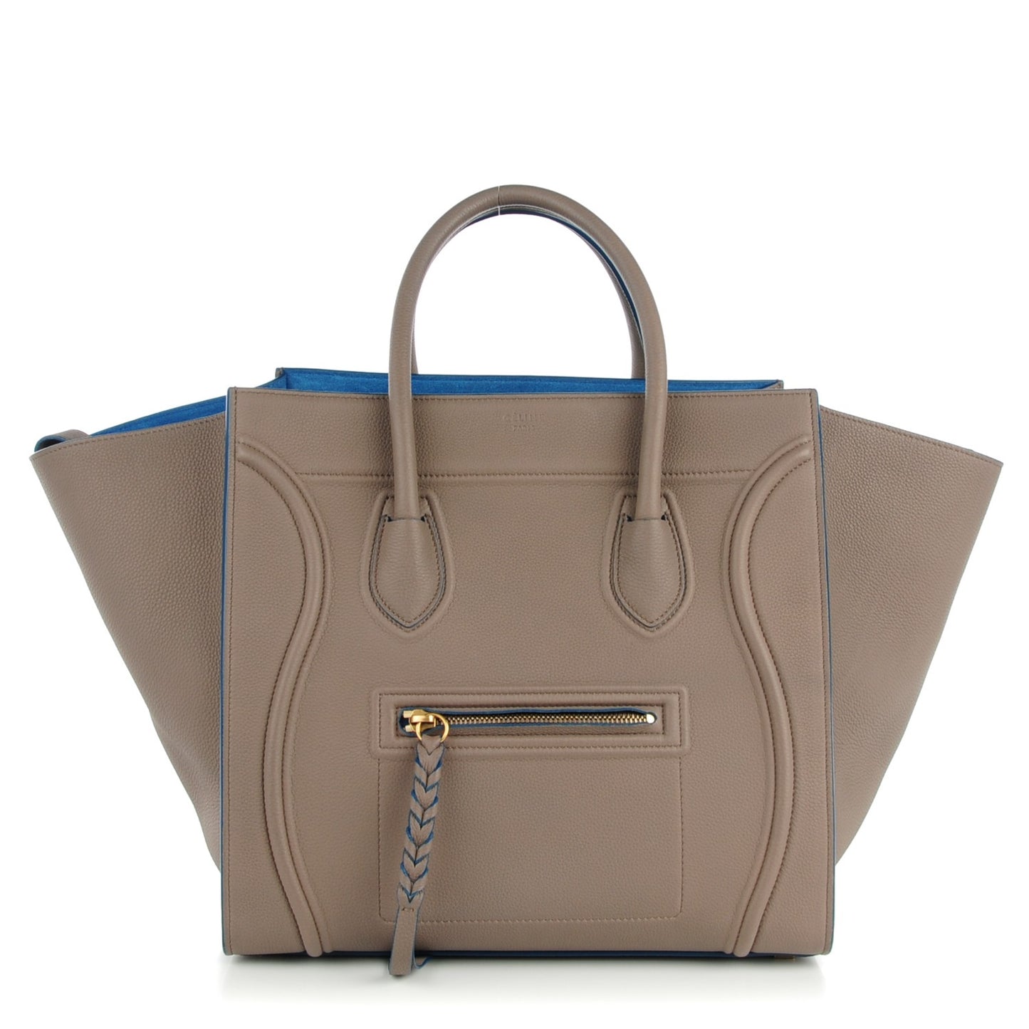 This is an authentic CELINE Baby Grained Calfskin Medium Phantom Luggage in Taupe with Blue trim. This stylish handbag is expertly designed of gray calfskin featuring signature Celine expandable sides and a blue trim detailing. The bag features comfortable rolled leather top handles, curved piping detailing, and a braided tassel trimmed zipper pull. The top is open to a spacious bright blue suede interior with a zipper pocket. This is an excellent tote for daily excursions, with the chic sophistication only from Celine!Follow this item for alerts. Celine is a registered trademark of Celine. FASHIONPHILE is not affiliated with Celine.