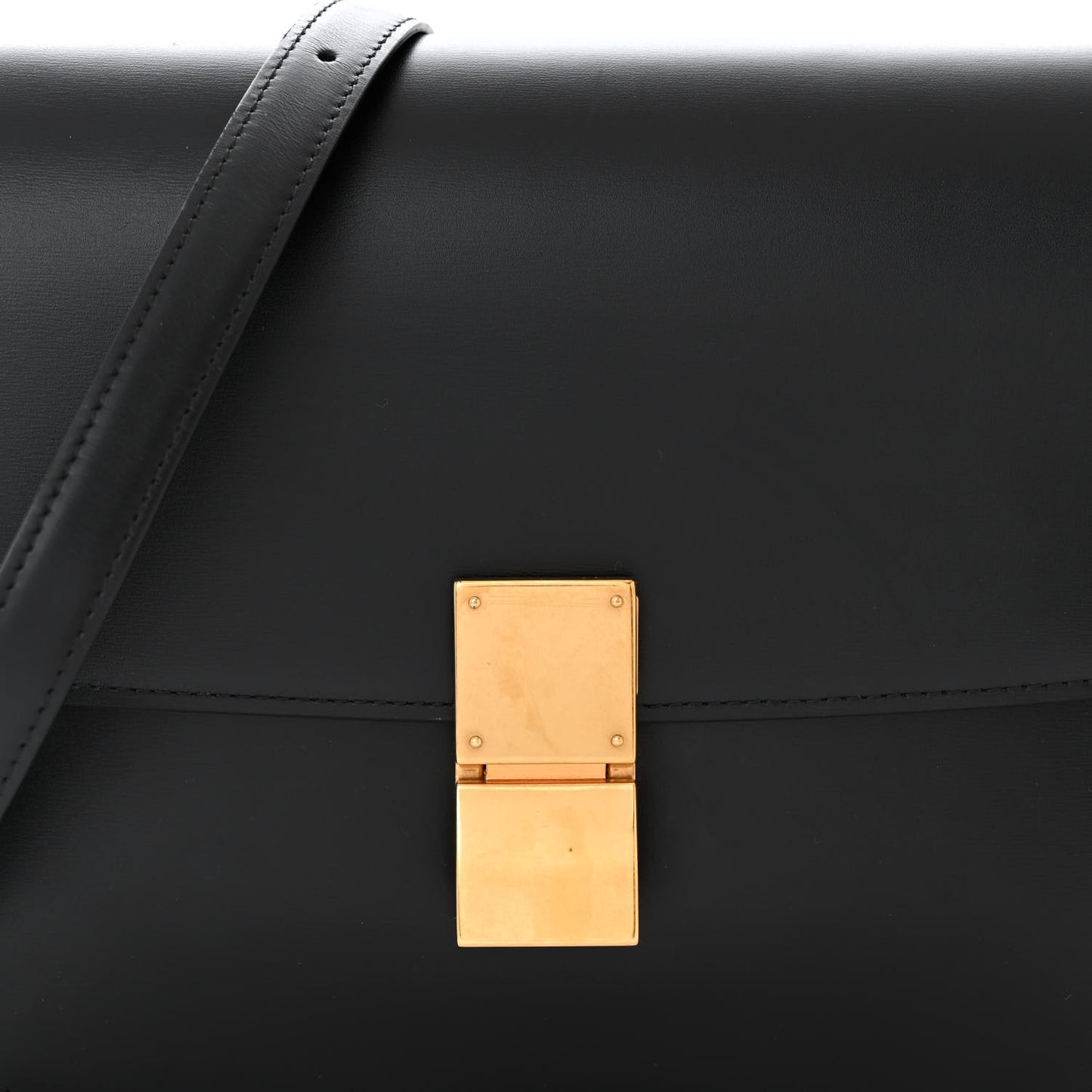 This is an authentic CELINE Box Calfskin Medium Classic Box Flap in Black. This bag is crafted of calfskin leather in black. This shoulder bag features a facing gold press lock that opens the flap to a partitioned matte black leather interior with a zipper compartment and patch pockets.Follow this item for alerts. Celine is a registered trademark of Celine. FASHIONPHILE is not affiliated with Celine.