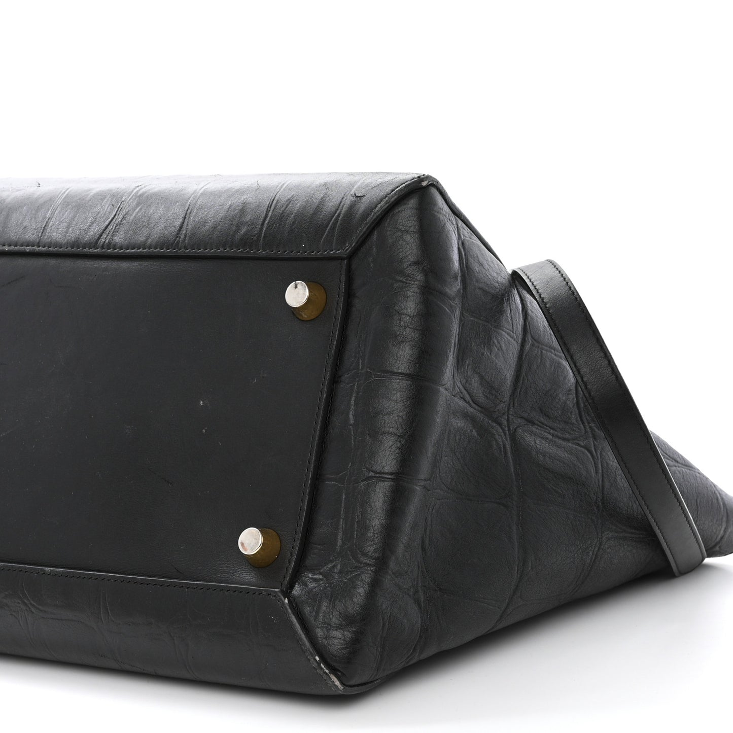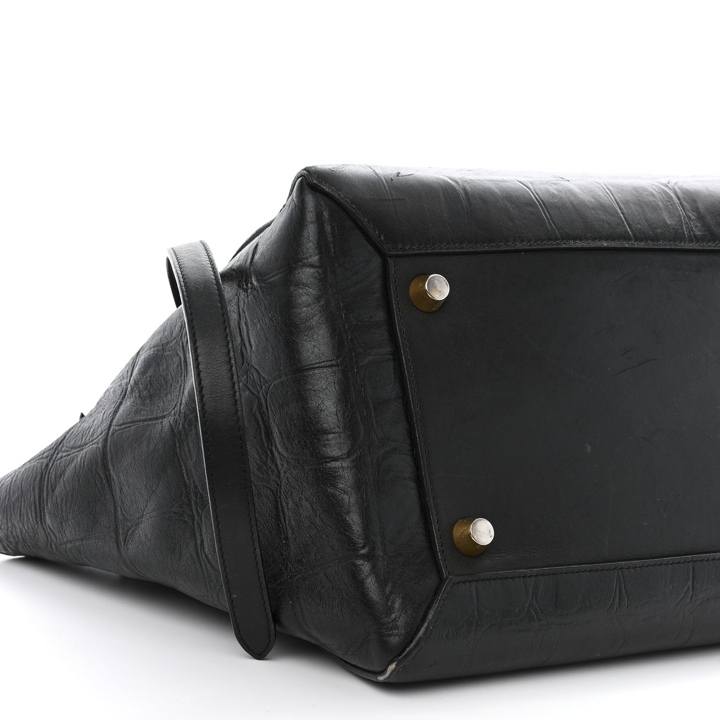 This is an authentic CELINE Calfskin Crocodile Embossed Small Belt Bag in Black. This stylish bag is crafted of textured calfskin leather in black with smooth black leather accents. The bag features a leather strap handle, black leather flap with knotted belt closure, and a rear zipper pocket. The overextended top zipper opens to a black suede interior with flat pockets.Follow this item for alerts. Celine is a registered trademark of Celine. FASHIONPHILE is not affiliated with Celine.